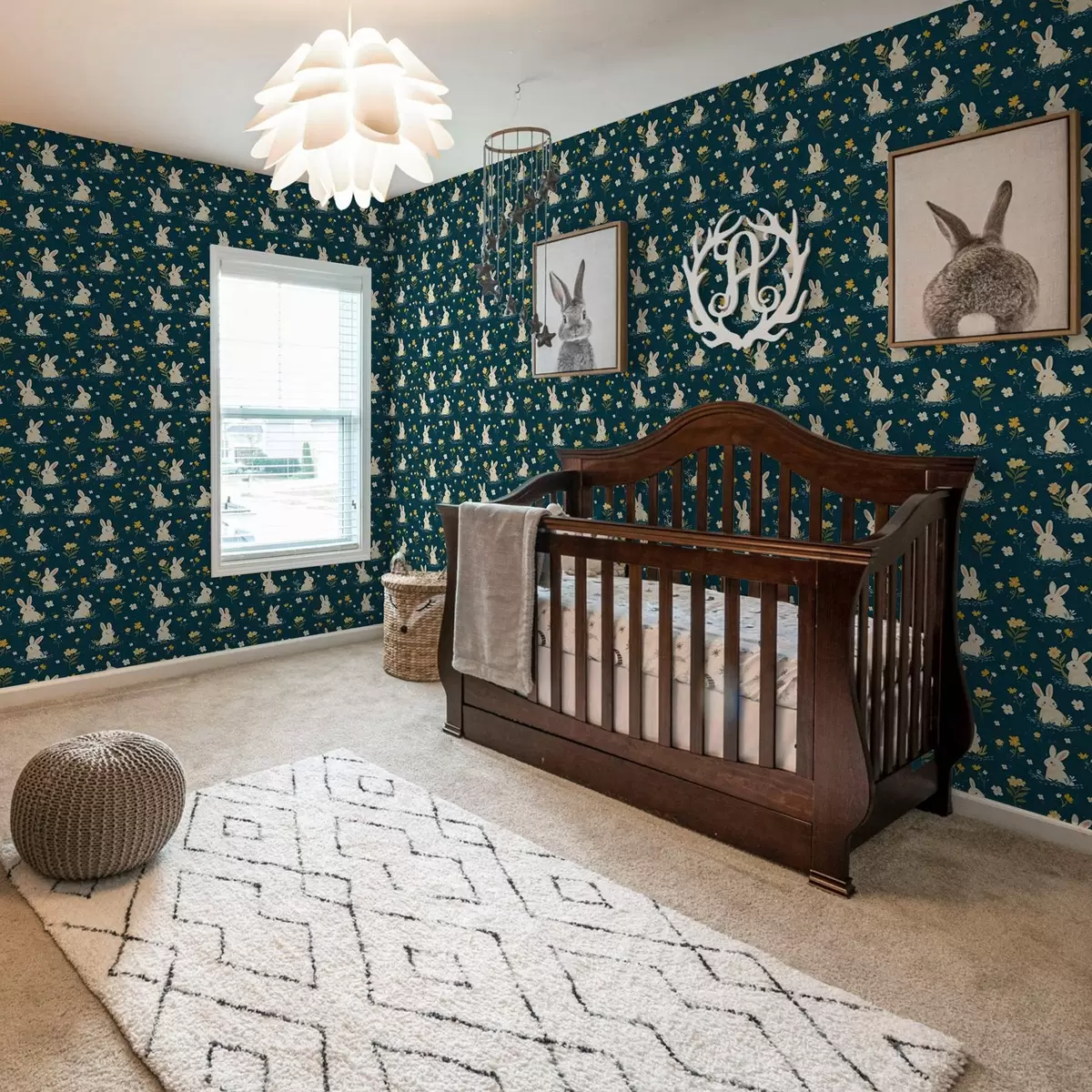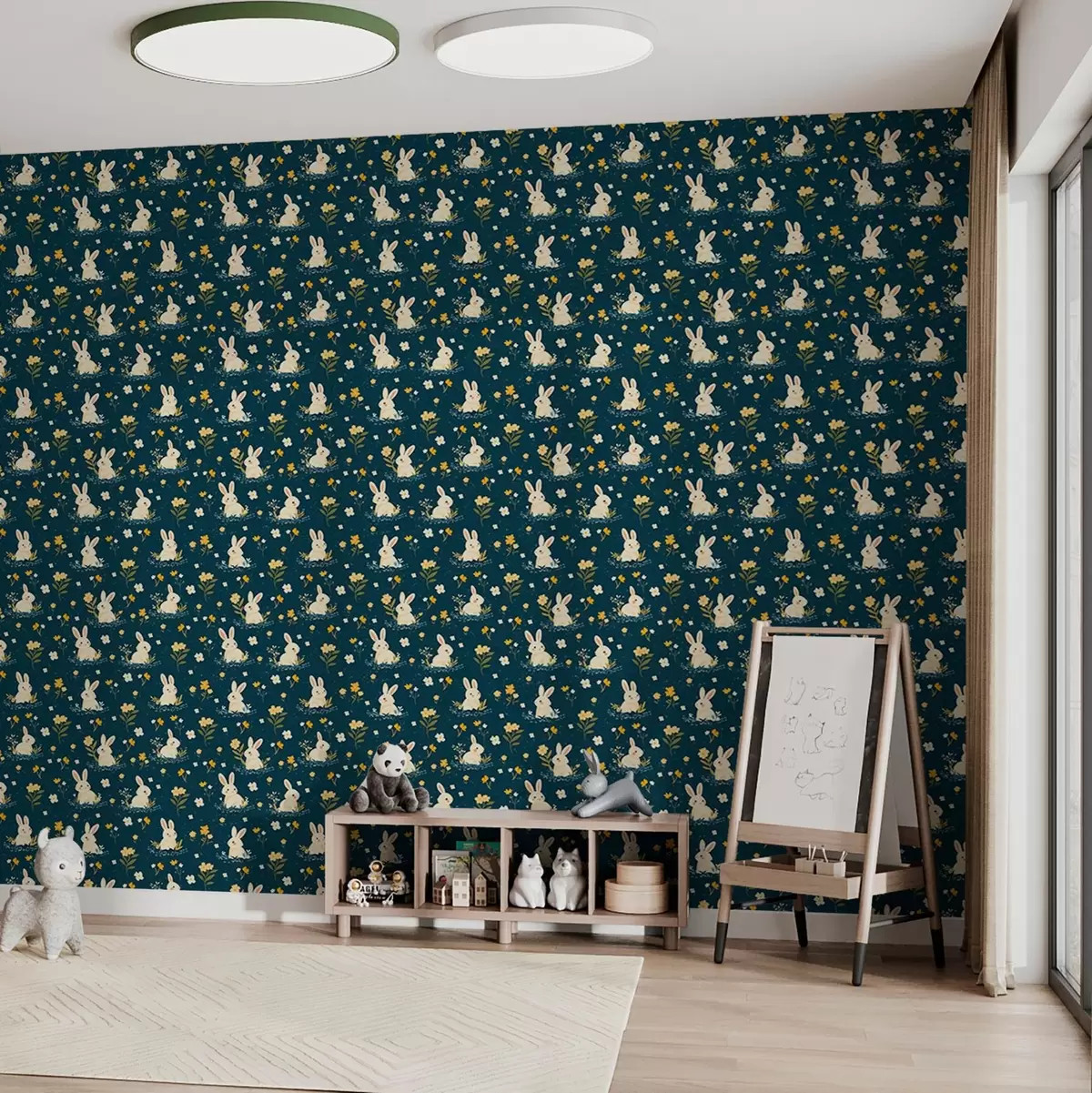 Tapete Kaninchen im Gras und Blumen auf dunklem Hintergrund Nr. a00080