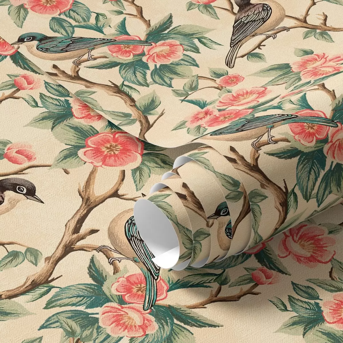 Tapete Kleine Vögel auf Zweigen mit Blumen auf hellem Hintergrund Nr. a00093
