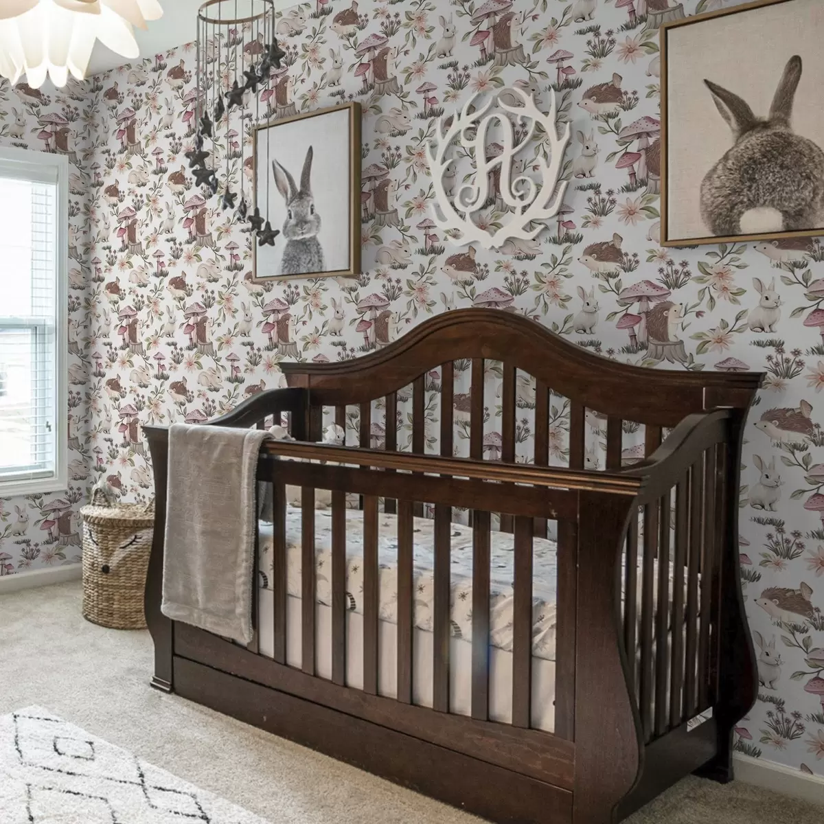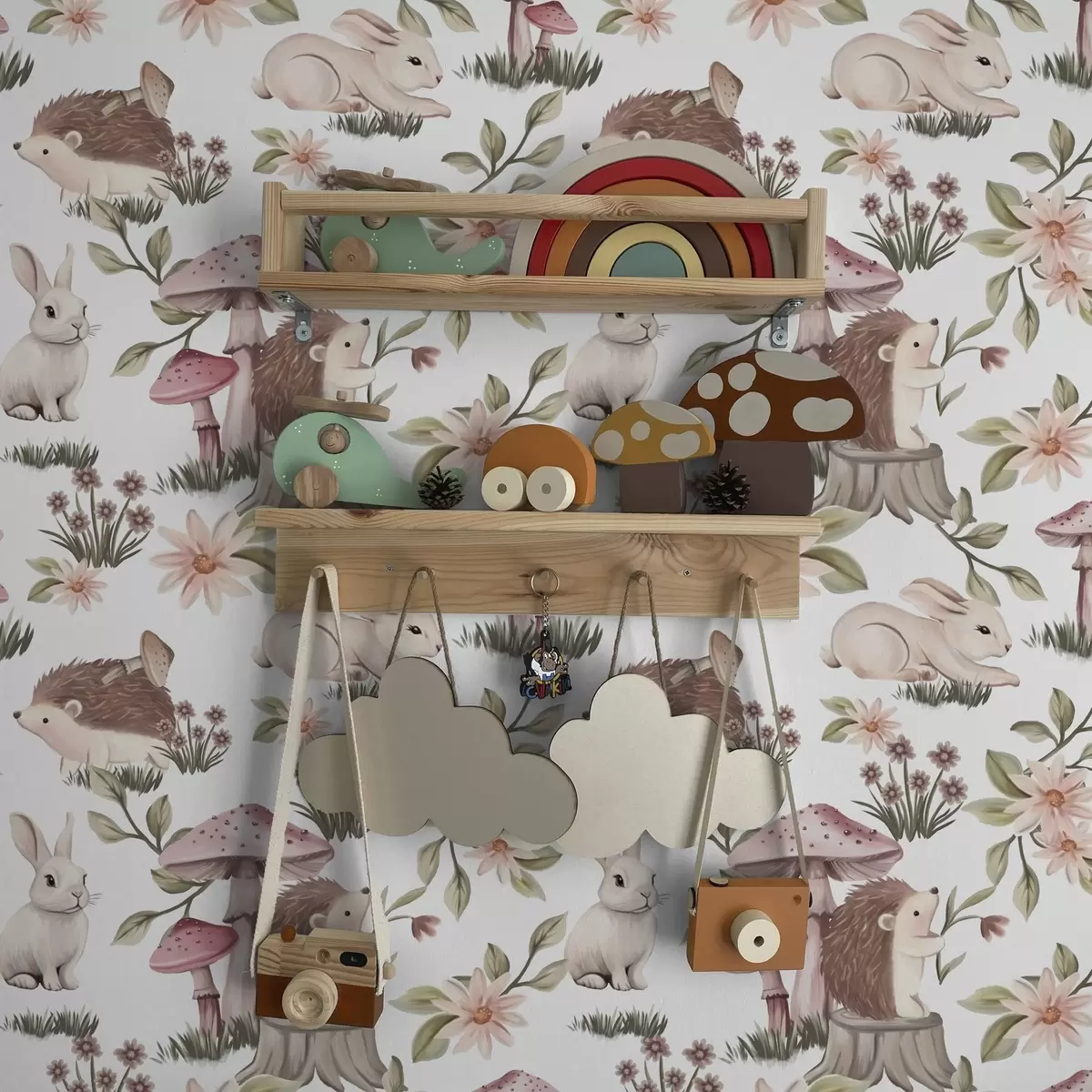 Tapete Igel und Kaninchen auf weißem Hintergrund mit zarten Blumen und Pilzen Nr. a00111v2