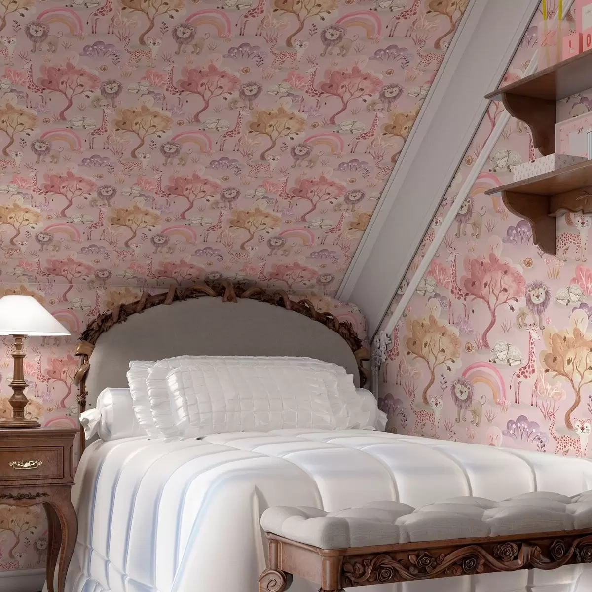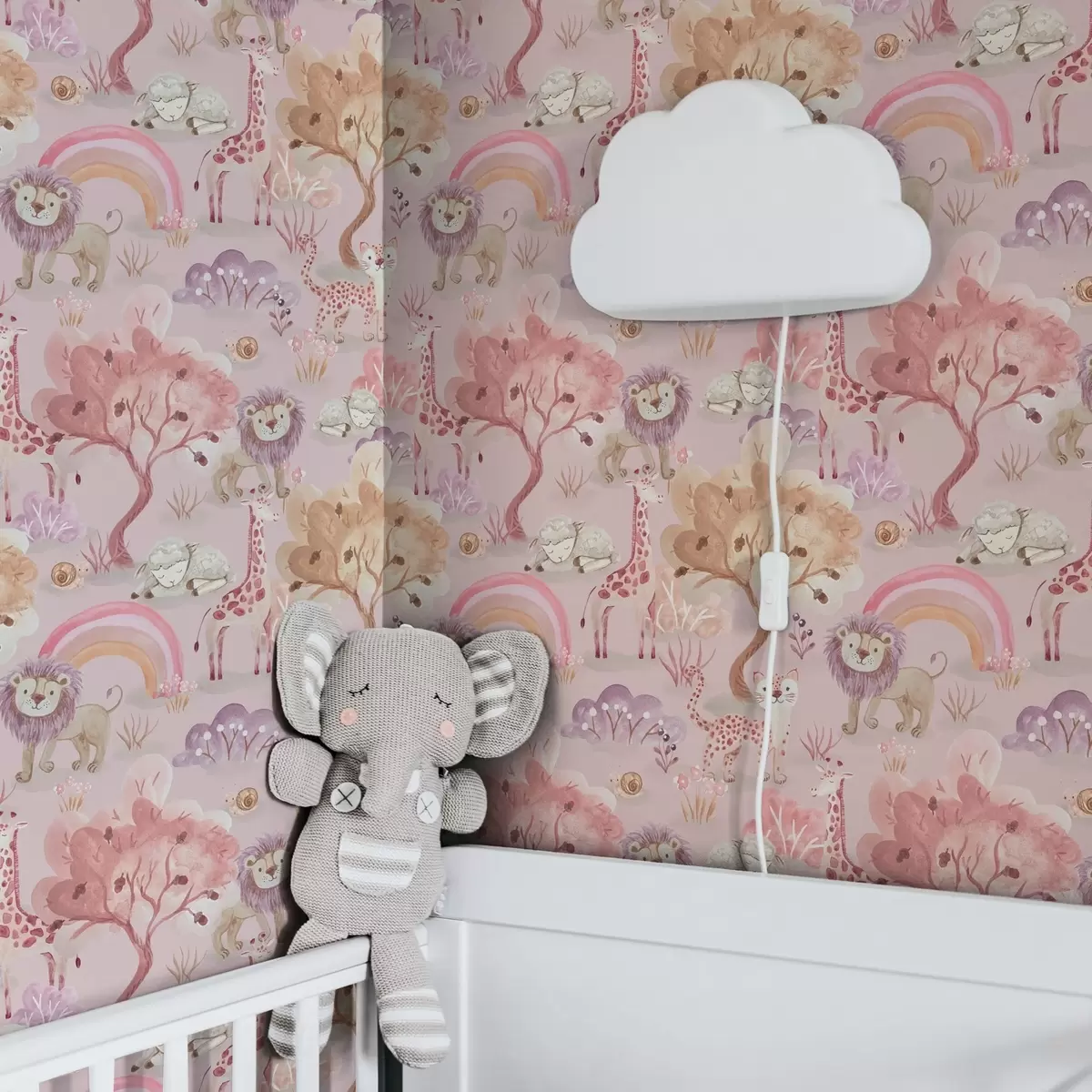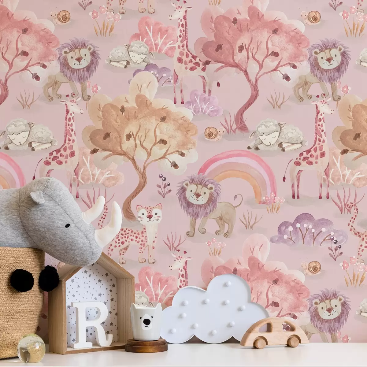 Tapete Löwenjunge, Giraffen und Regenbögen in einem pastellfarbenen Wald Nr. a00112