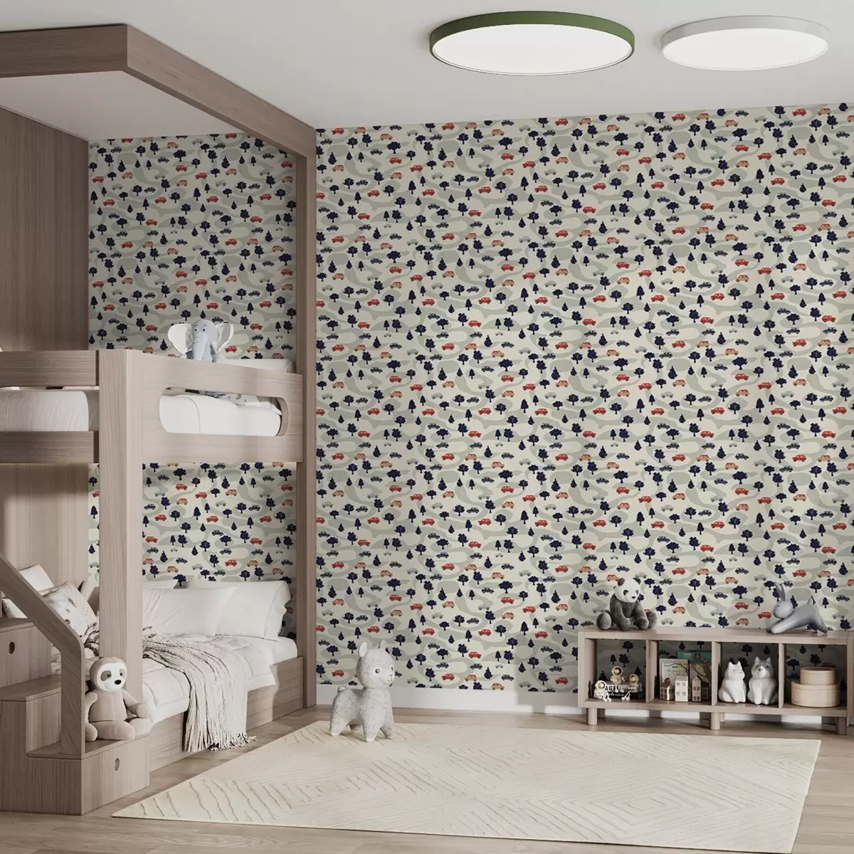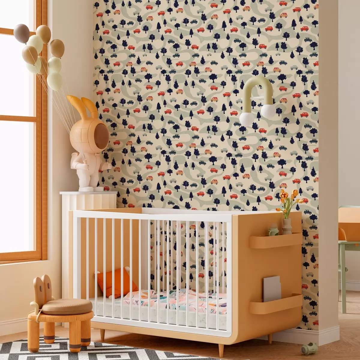 Tapete Lustige Autos zwischen den Bäumen auf einem cremefarbenen Hintergrund Nr. a00119