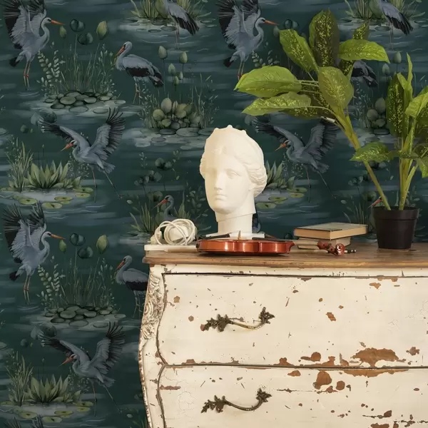 Tapete Szenen mit Reihern auf dem Hintergrund von Teichen und Seerosen Nr. a00202