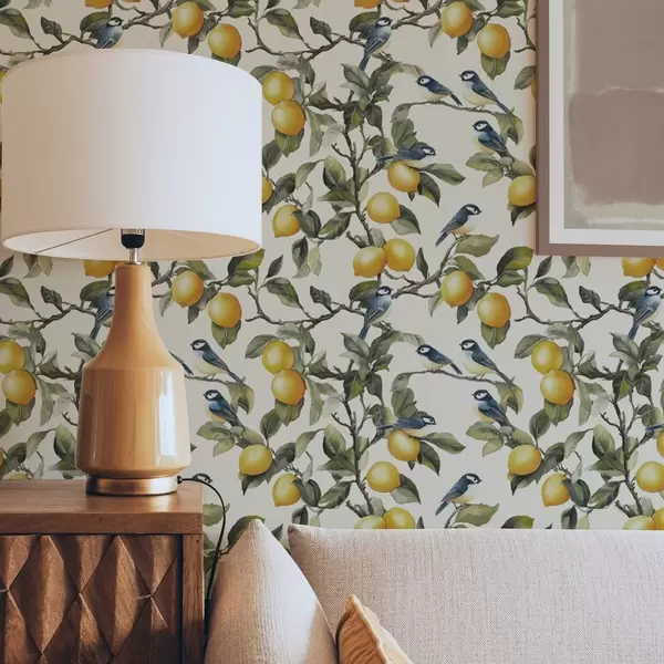 Tapete Vögel und Zitronen auf den Zweigen, botanische Aquarellzeichnung Nr. a00207