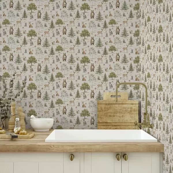 Tapete Waldtiere im weichen Aquarellstil, Bäume und Pilze Nr. a00212
