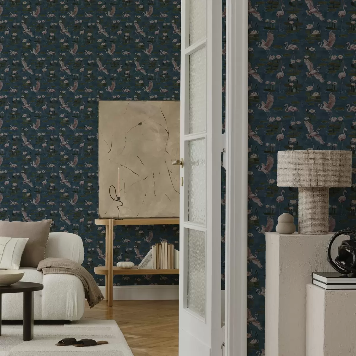 Tapete Flamingo zwischen Seerosen, tropische Szene auf marineblauem Hintergrund Nr. a00237