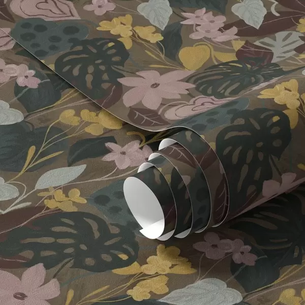 Tapete Dunkle tropische Blätter und Blumen in einem dichten Gemälde dichtes Gemälde Nr. a00244
