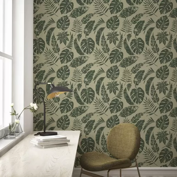 Tapete Tropische Blätter im Linolschnitt-Stil, grün auf gelb Nr. a00274