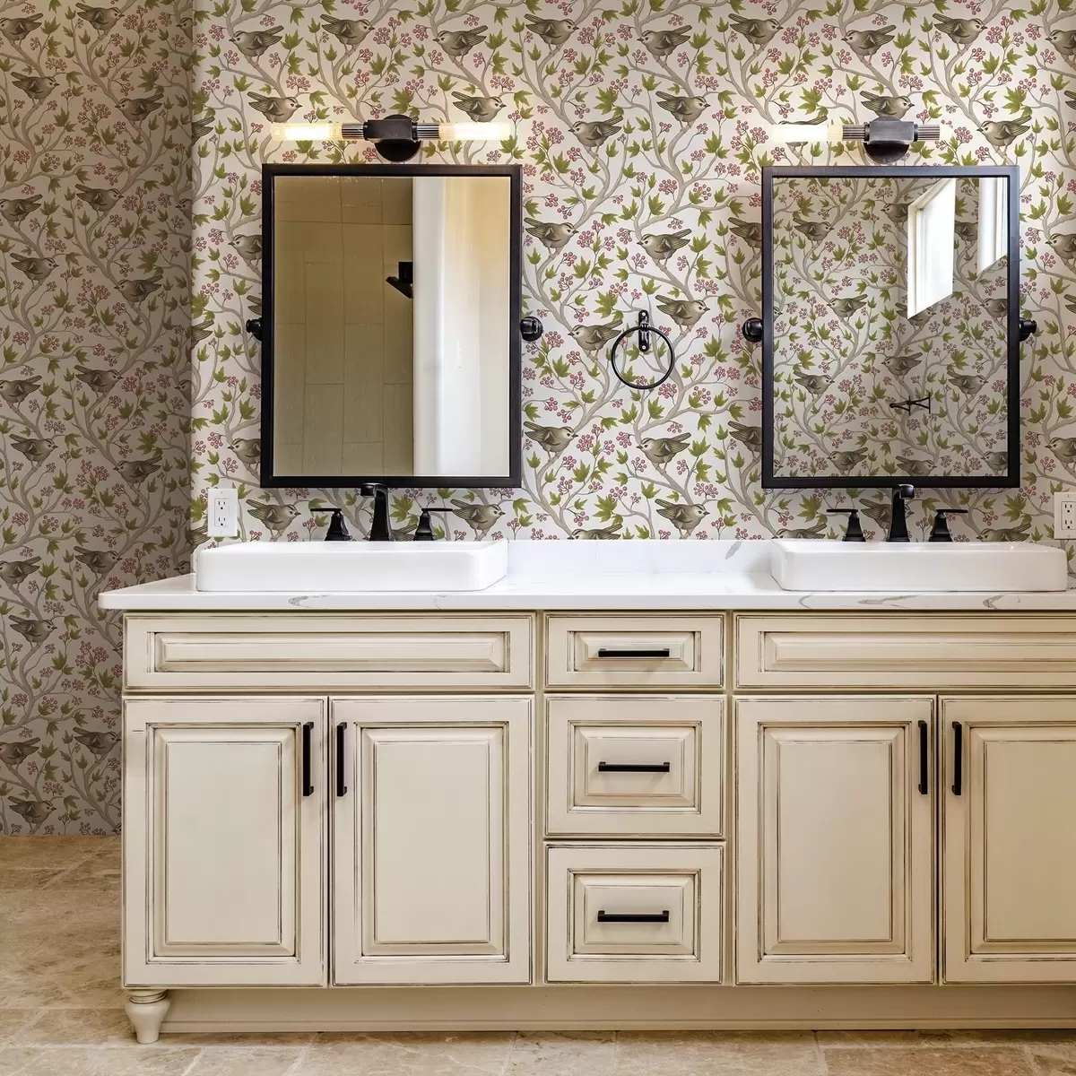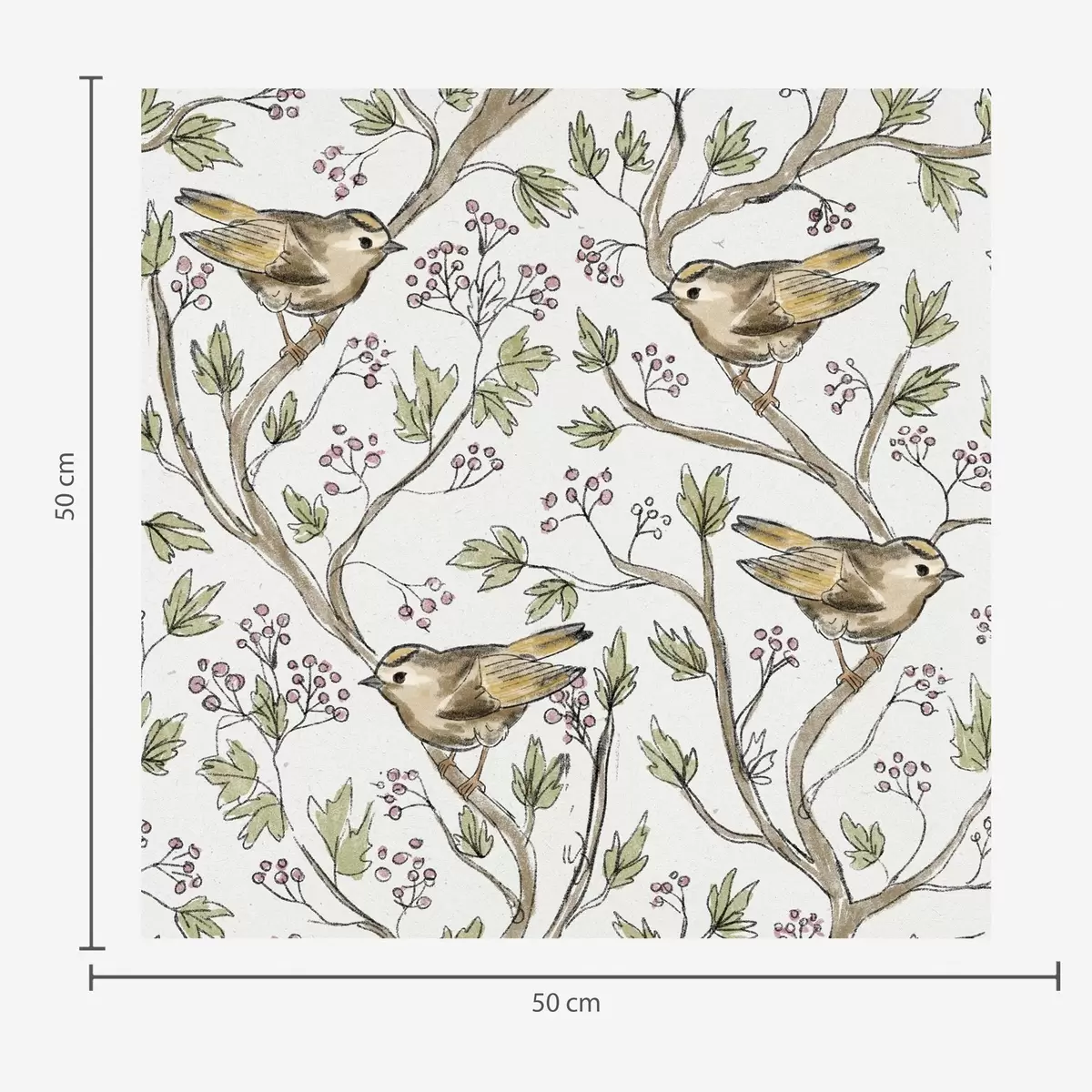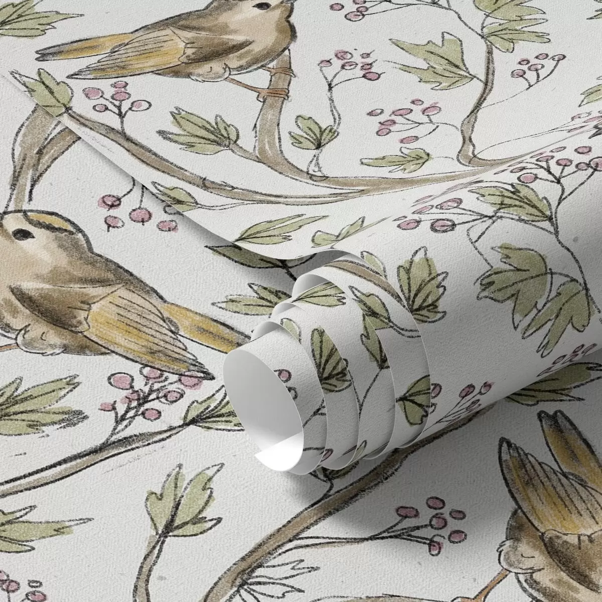Tapete Vögel auf Zweigen mit Blättern und Beeren auf einem weißen Hintergrund a00283