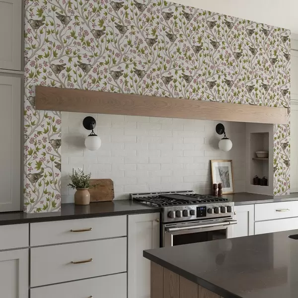 Tapete Vögel auf Zweigen mit Blättern und Beeren auf einem weißen Hintergrund Nr. a00283