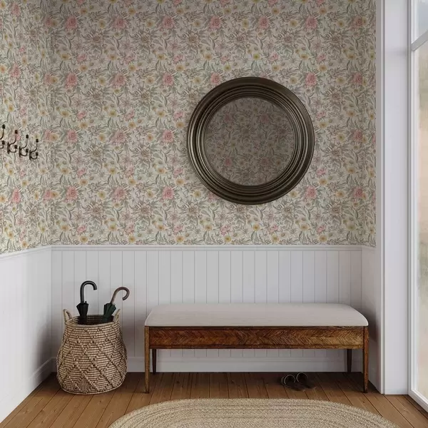 Tapete Gänseblümchen, Pfingstrosen, Lilien und Blätter in zarten Farben Nr. a00299