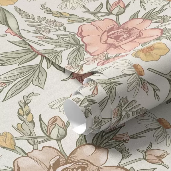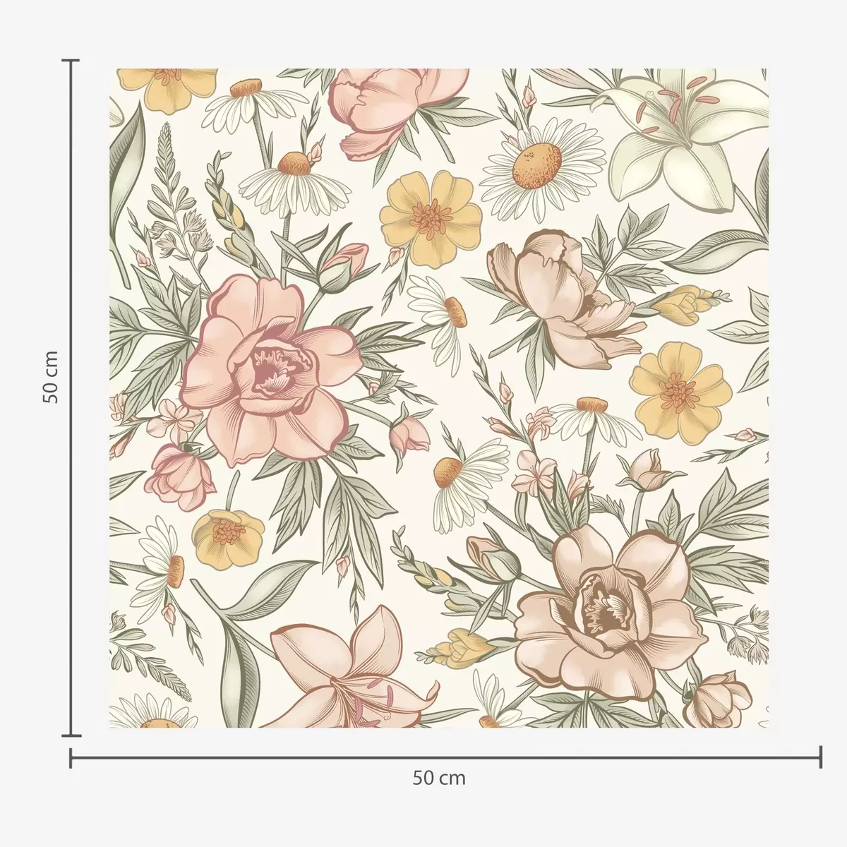 Tapete Gänseblümchen, Pfingstrosen, Lilien und Blätter in zarten Farben Nr. a00299