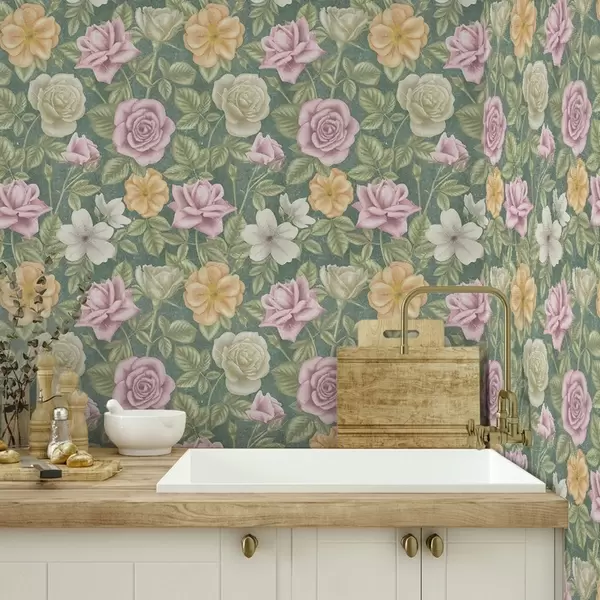 Tapete Rosa Creme und gelbe Rosen auf grünem Hintergrund a00300
