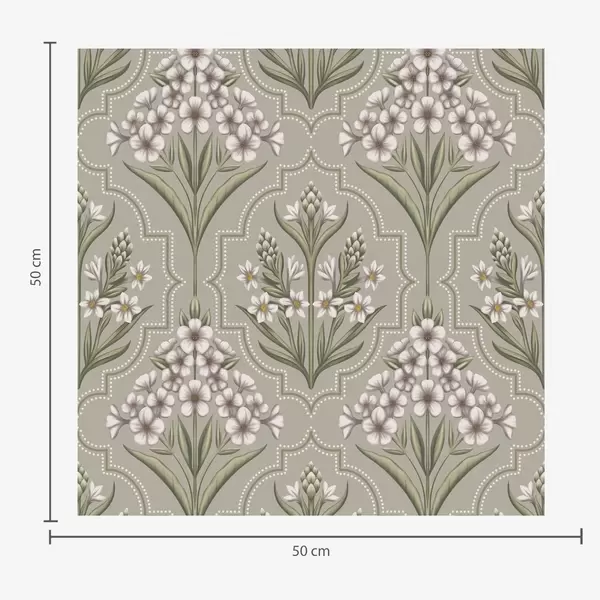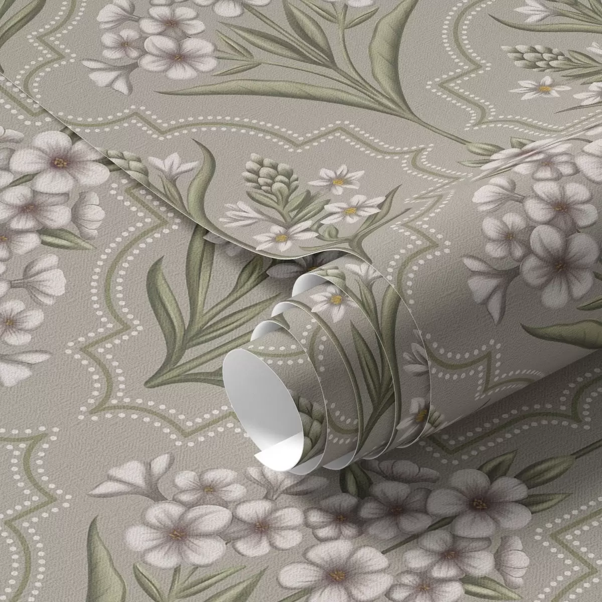 Tapete Symmetrisches Muster mit weißen Blumen auf grauem Hintergrund Nr. a00302