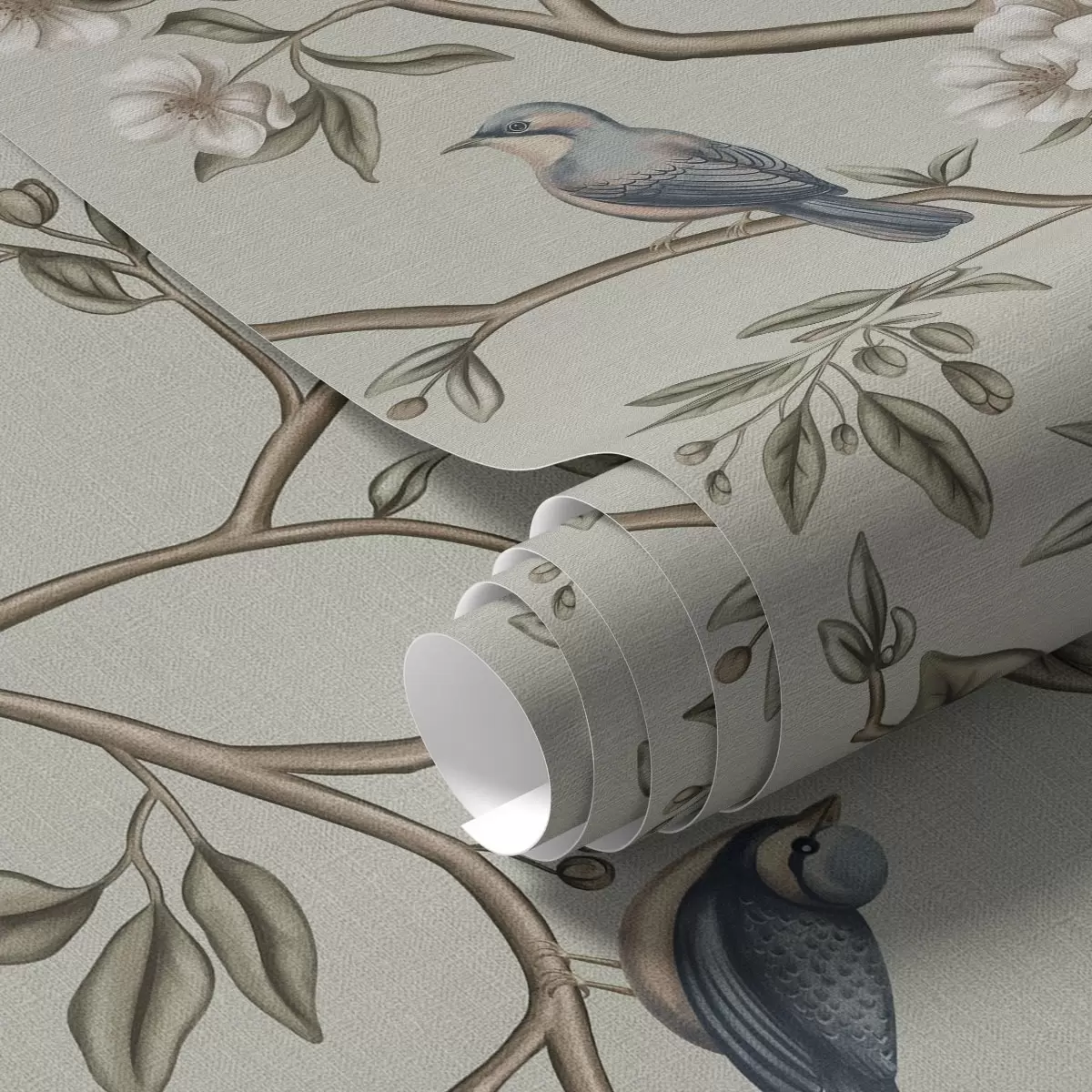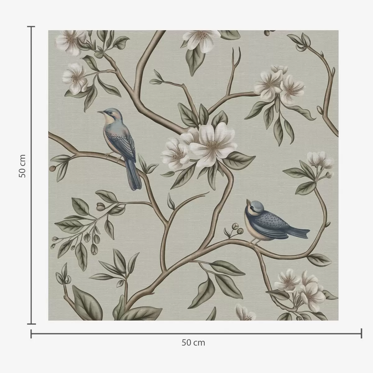 Tapete Zweige mit Vögeln und weißen Blumen auf einem zarten Hintergrund Nr. a00303
