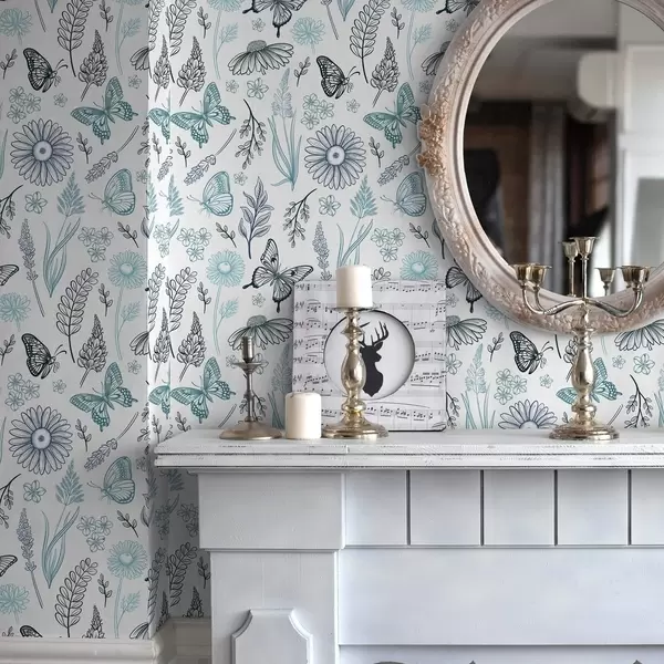 Tapete Konturierte Schmetterlinge und Blumen in Blau- und Blautönen Nr. a00311