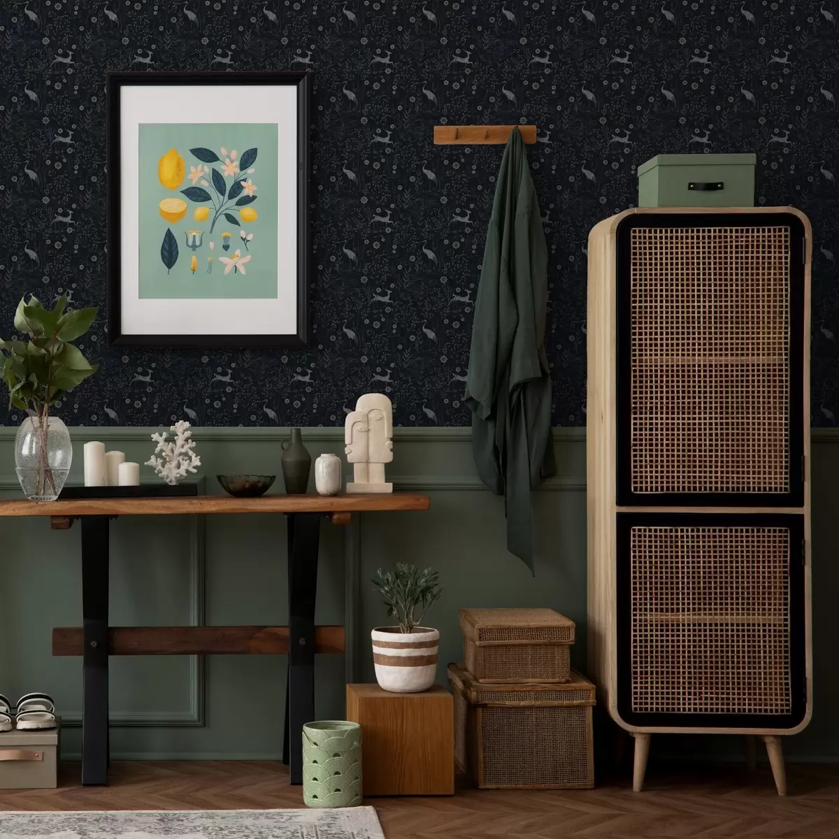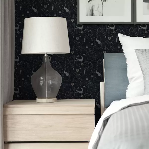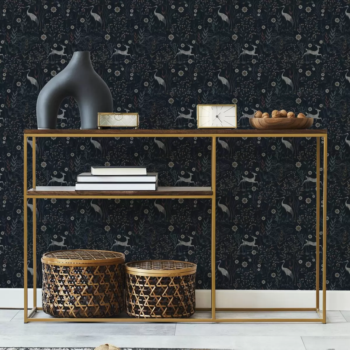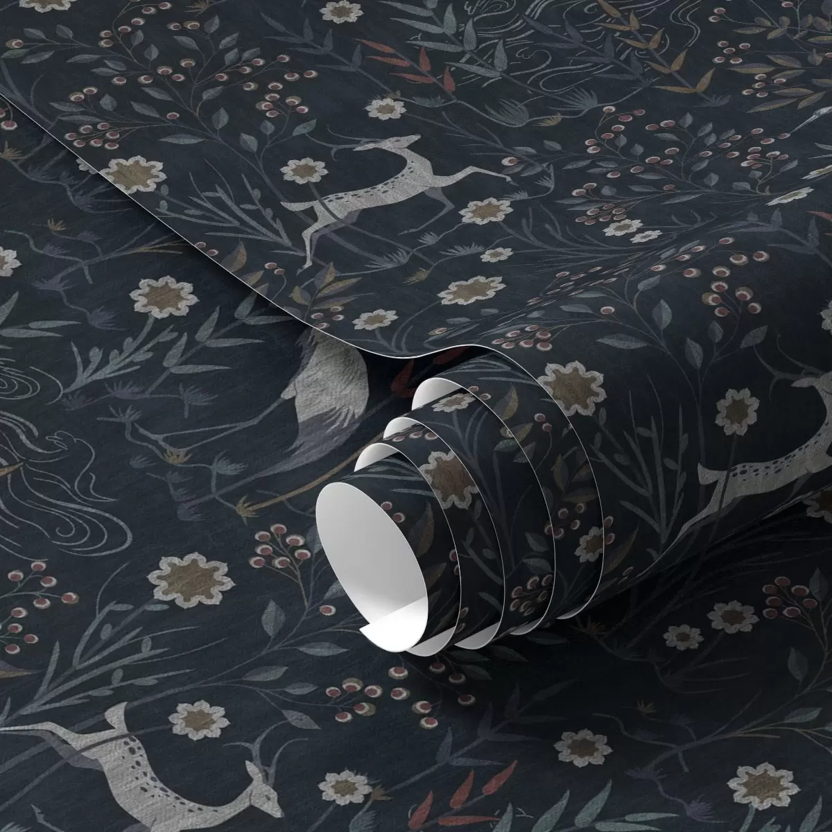 Tapete Dunkler Hintergrund mit weißen Vögeln und Hirschen Nr. a00363