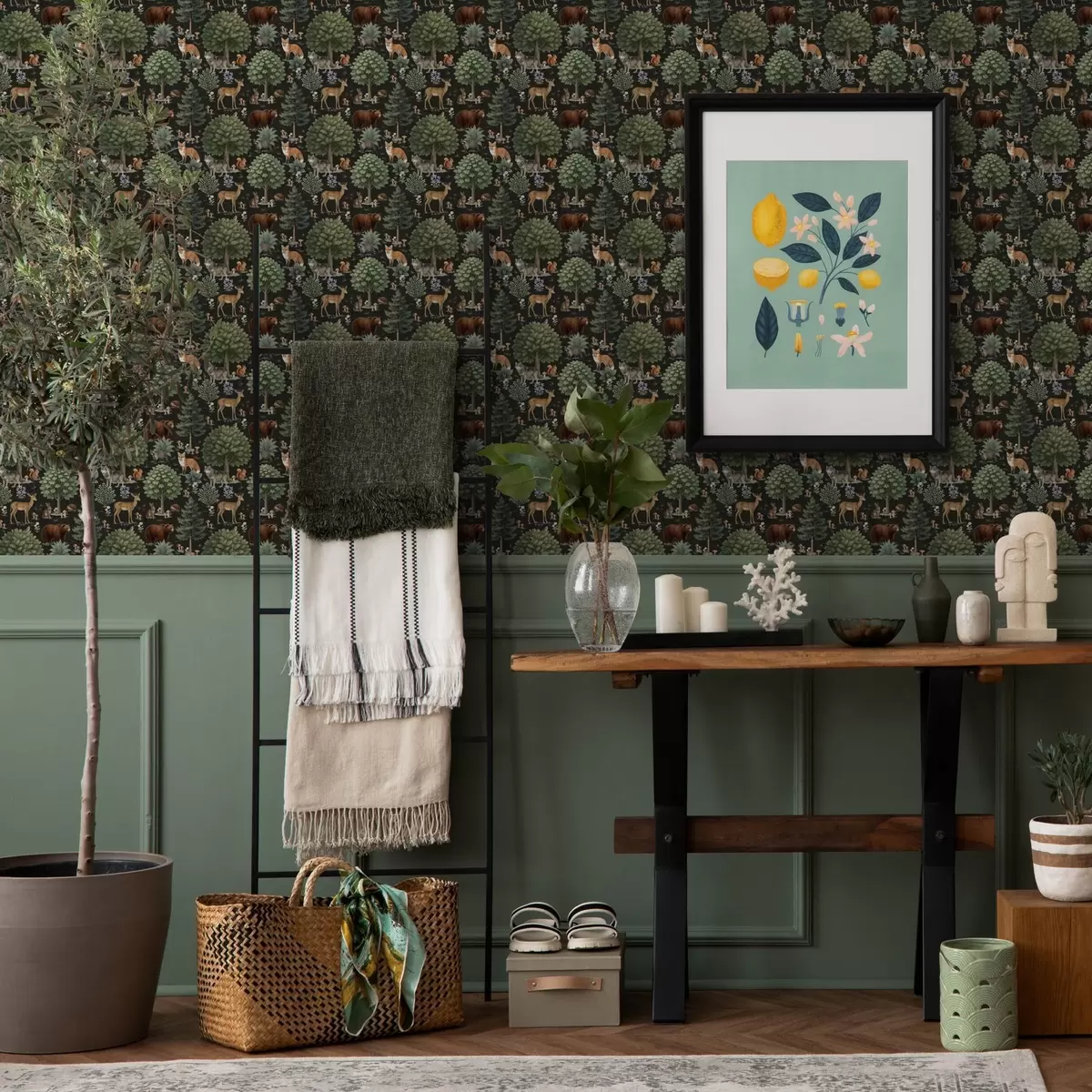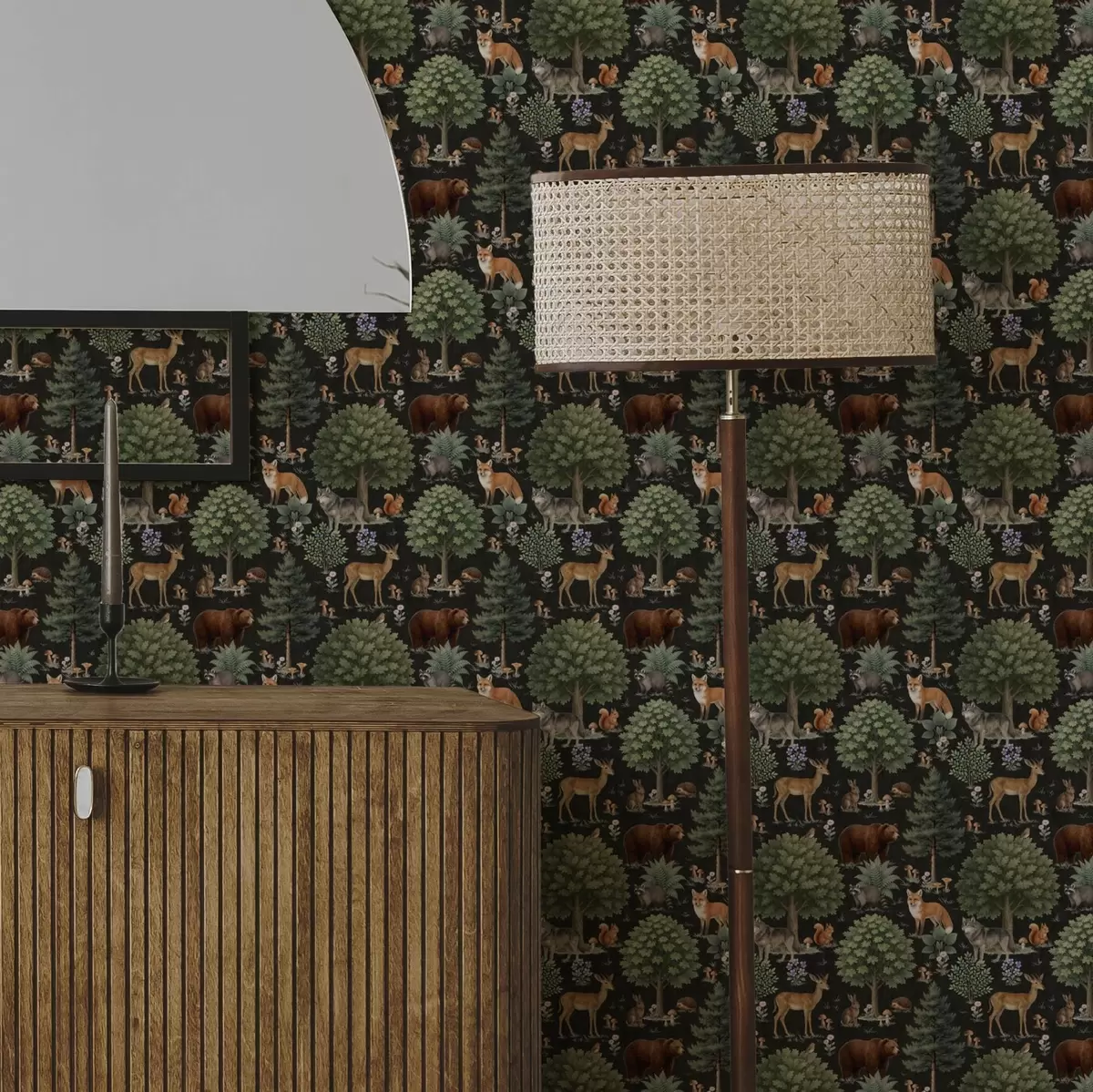 Tapete Aquarell Waldtiere mit Bäumen und Pilzen Nr. a00391