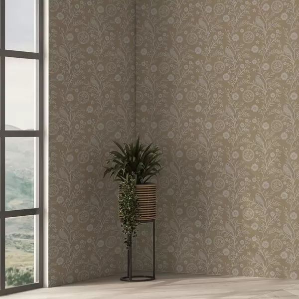 Tapete Zarte Skizze eines weißen Vogels und einer Blume weißer Vogel und Blume auf ockerfarbenem Hintergrund Nr. a00393