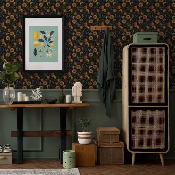Tapete Früchte und gelbe Blumen auf dunklem botanischem Hintergrund Nr. a00395