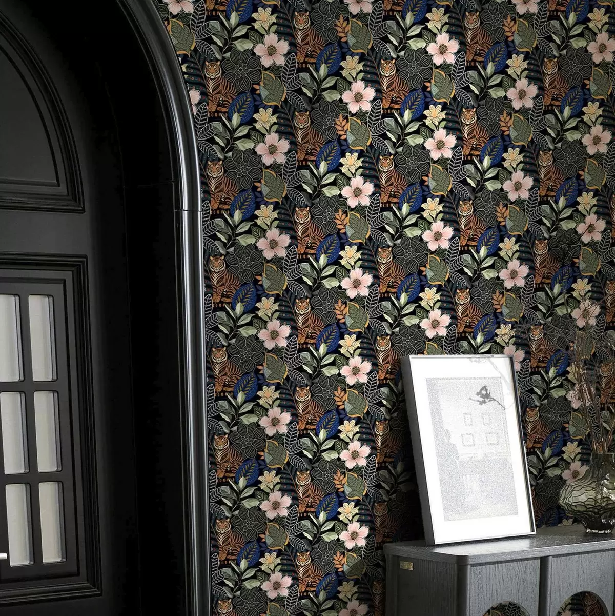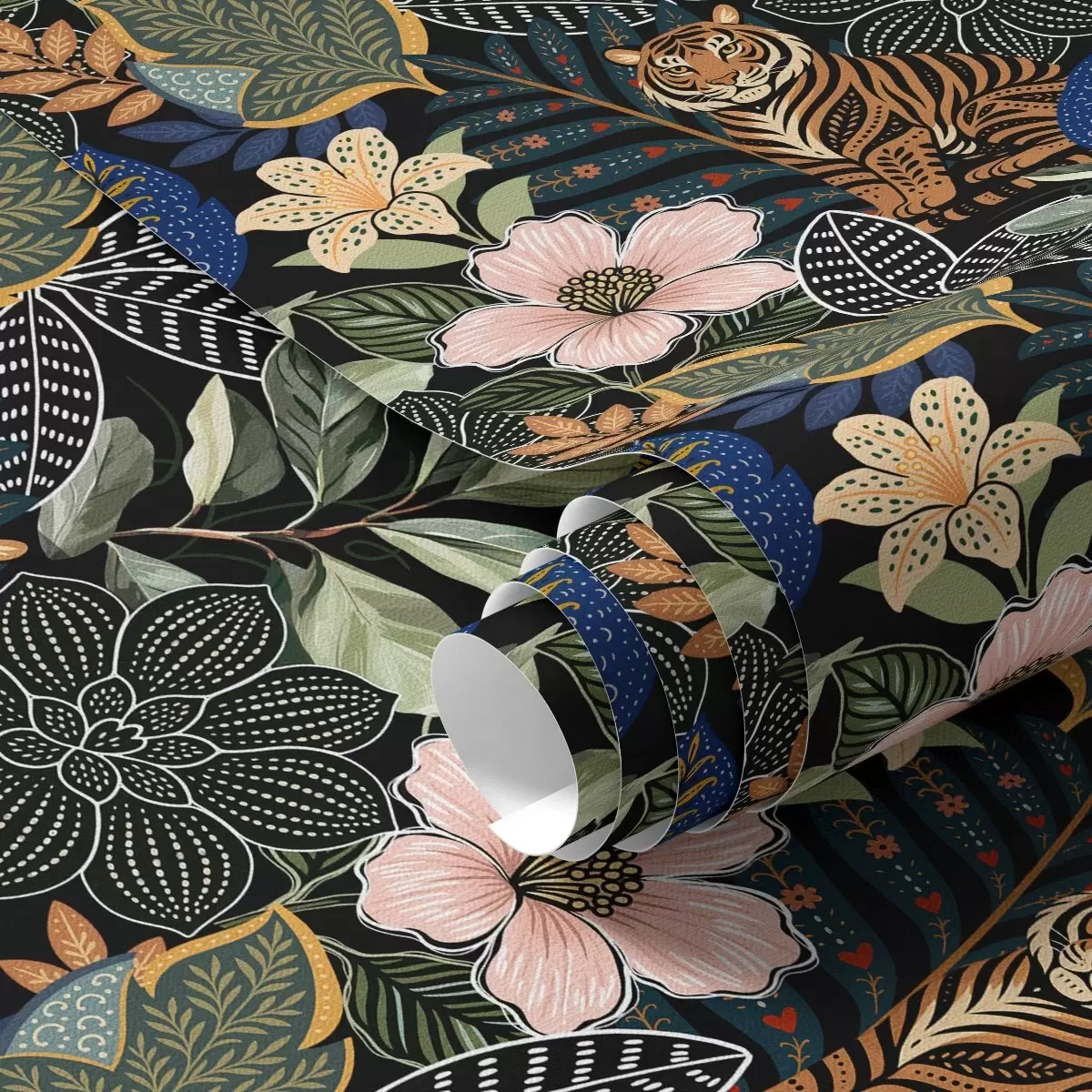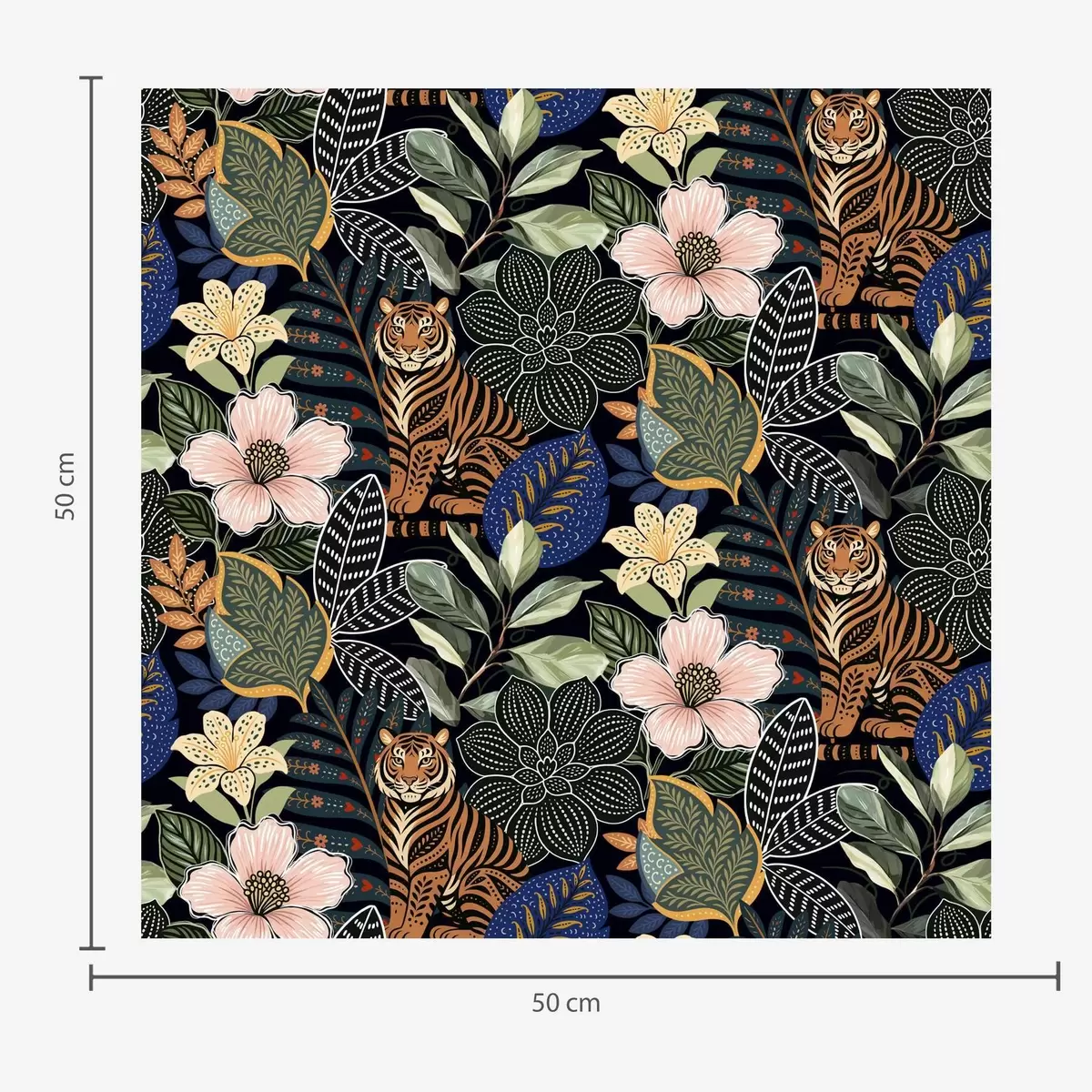 Tapete Tiger zwischen leuchtenden tropischen Blumen und Blättern Nr. a00426