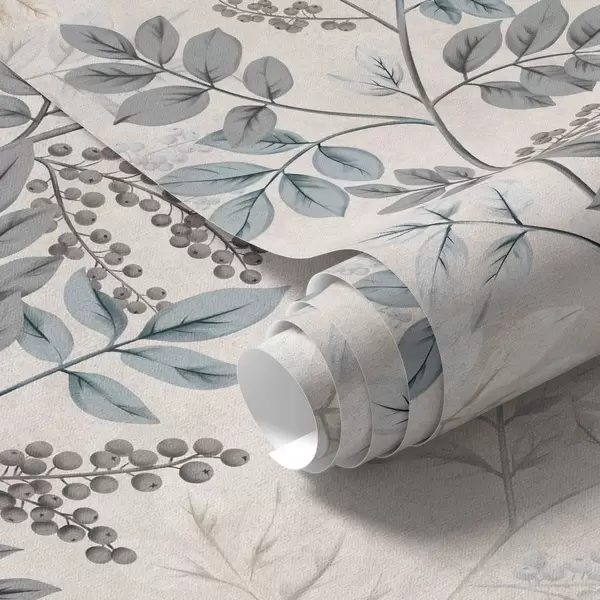 Tapete Beerenzweige in Pastelltönen mit grau-blauen Blättern Nr. a00443