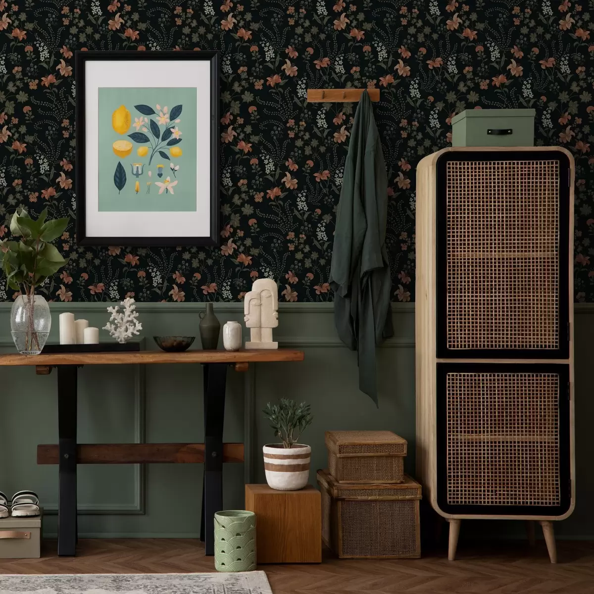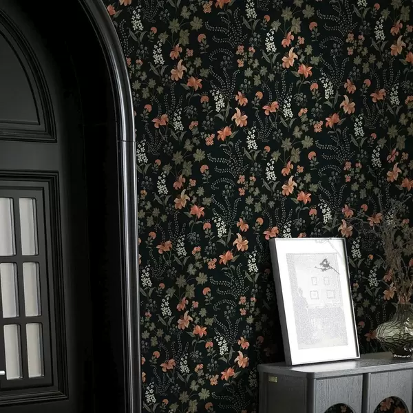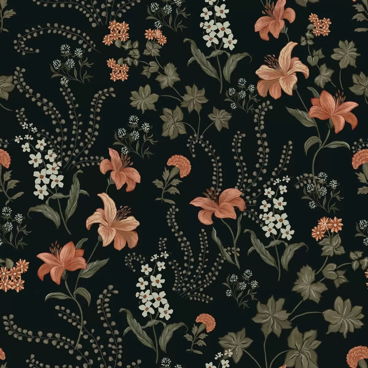 Tapete Orangefarbene Lilien und kleine Blumen auf schwarzem Hintergrund Nr. a00463