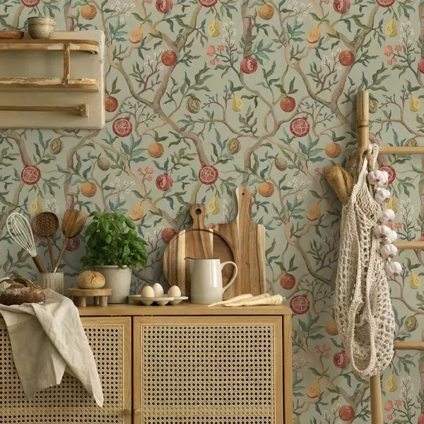 Tapete Granatapfelfrüchte, Birnen und Blumen auf einem blassgrünen Hintergrund Nr. a00465