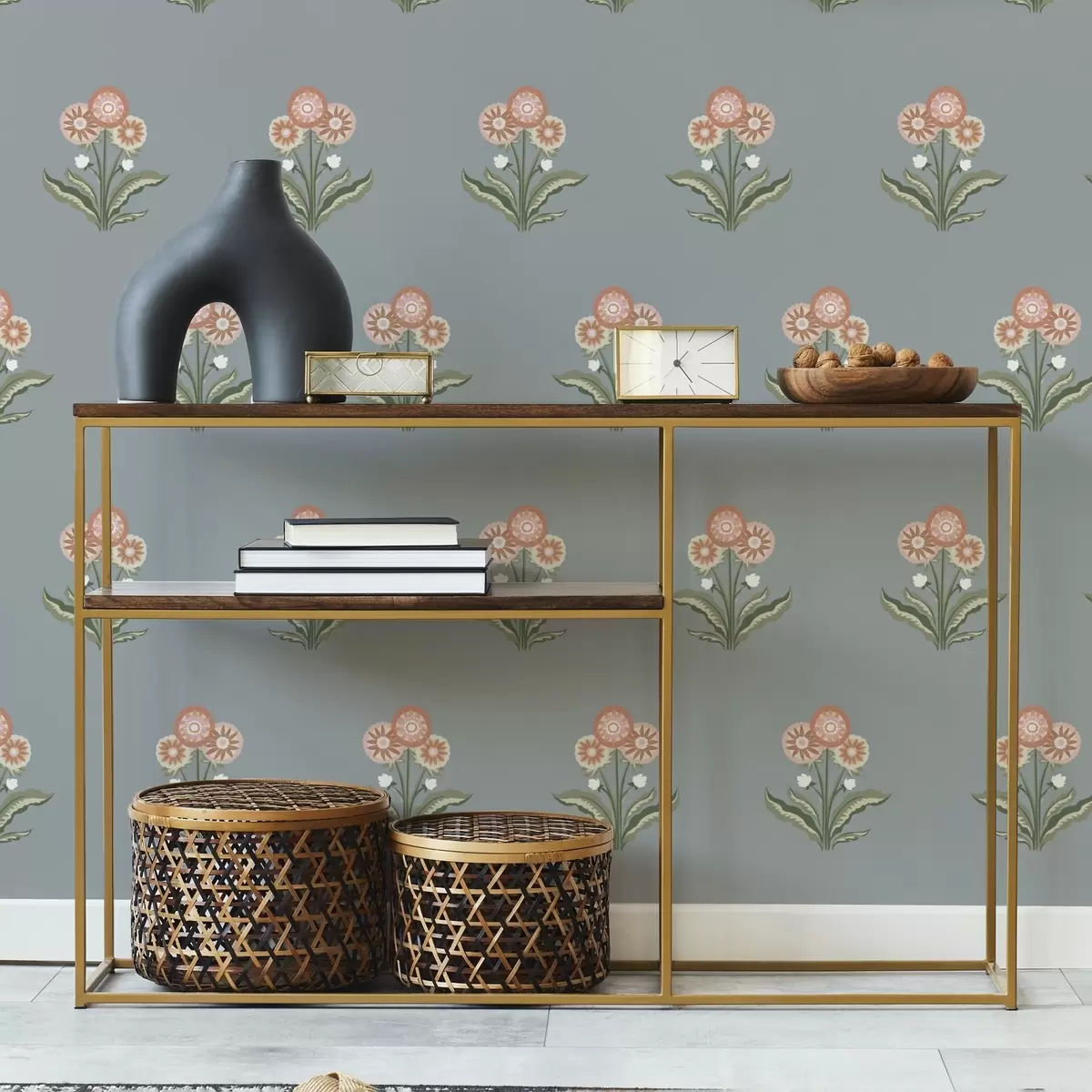 Tapete Stilisierte Blumen auf grau-blauem Hintergrund, warme Farbpalette Nr. a00494