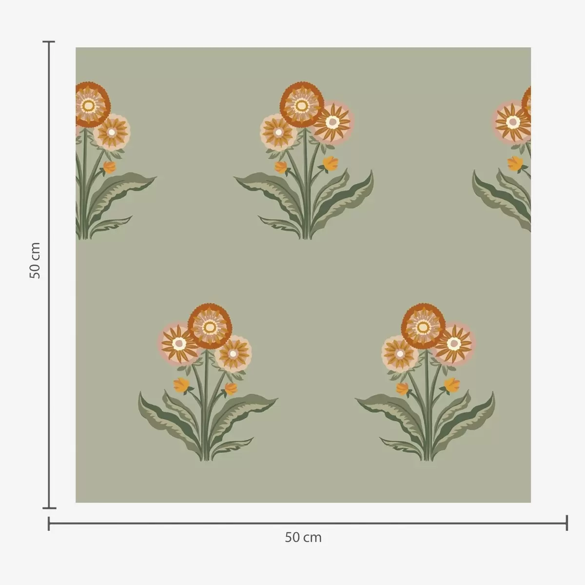 Tapete Stilisierte Blumen auf olivfarbenem Hintergrund, warme Farbtöne Nr. a00494v2