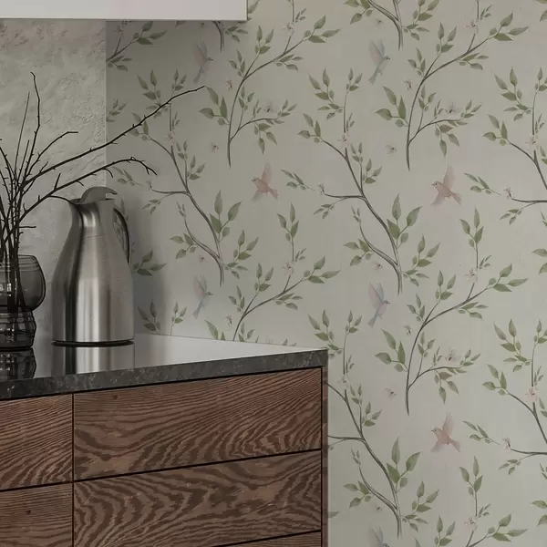 Tapete Aquarellzweige mit Blättern und Vögeln auf hellem Hintergrund Nr. a00496