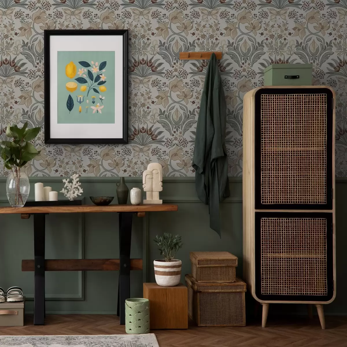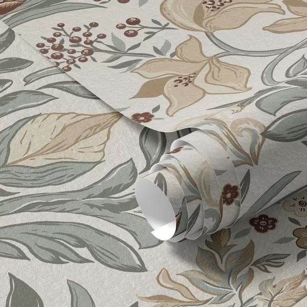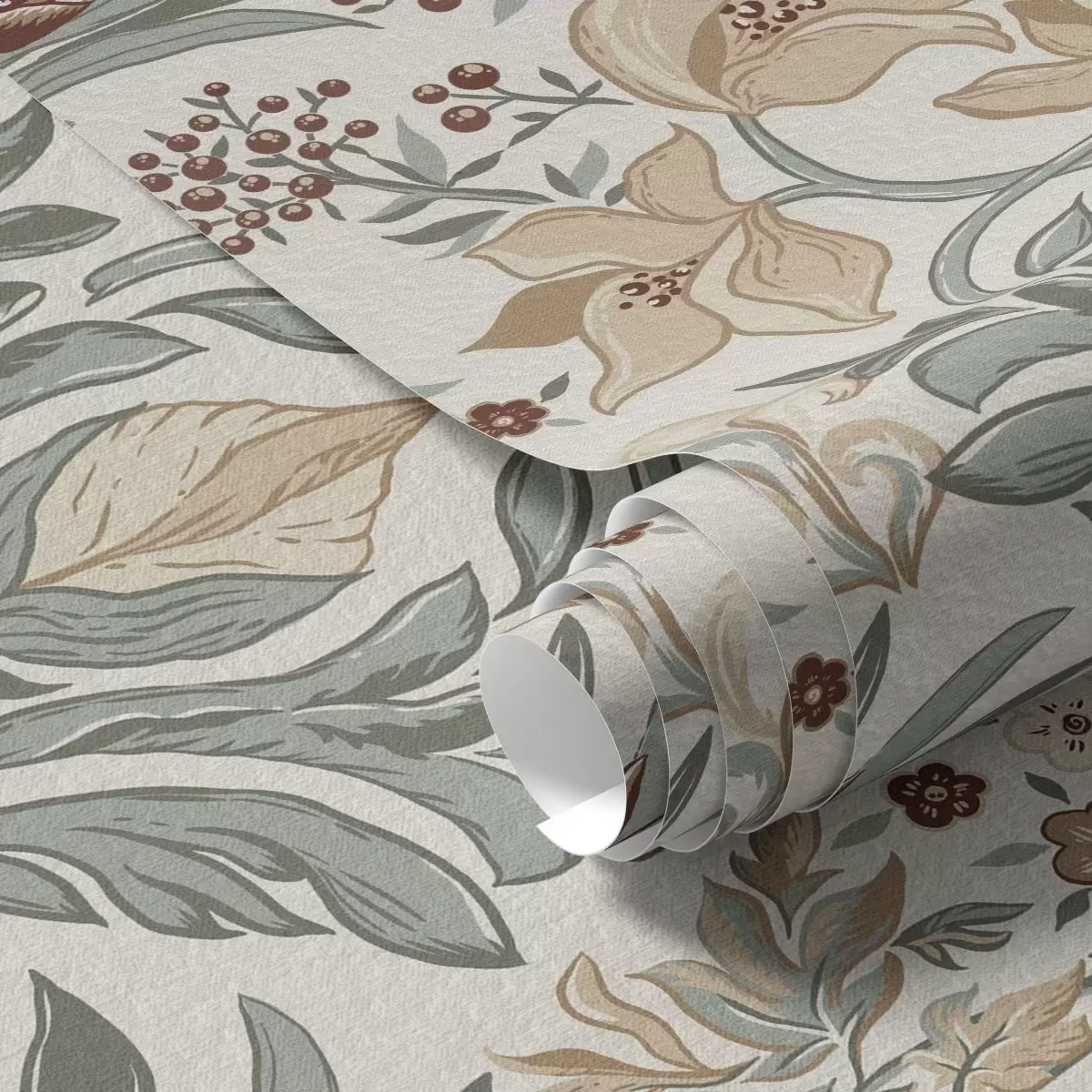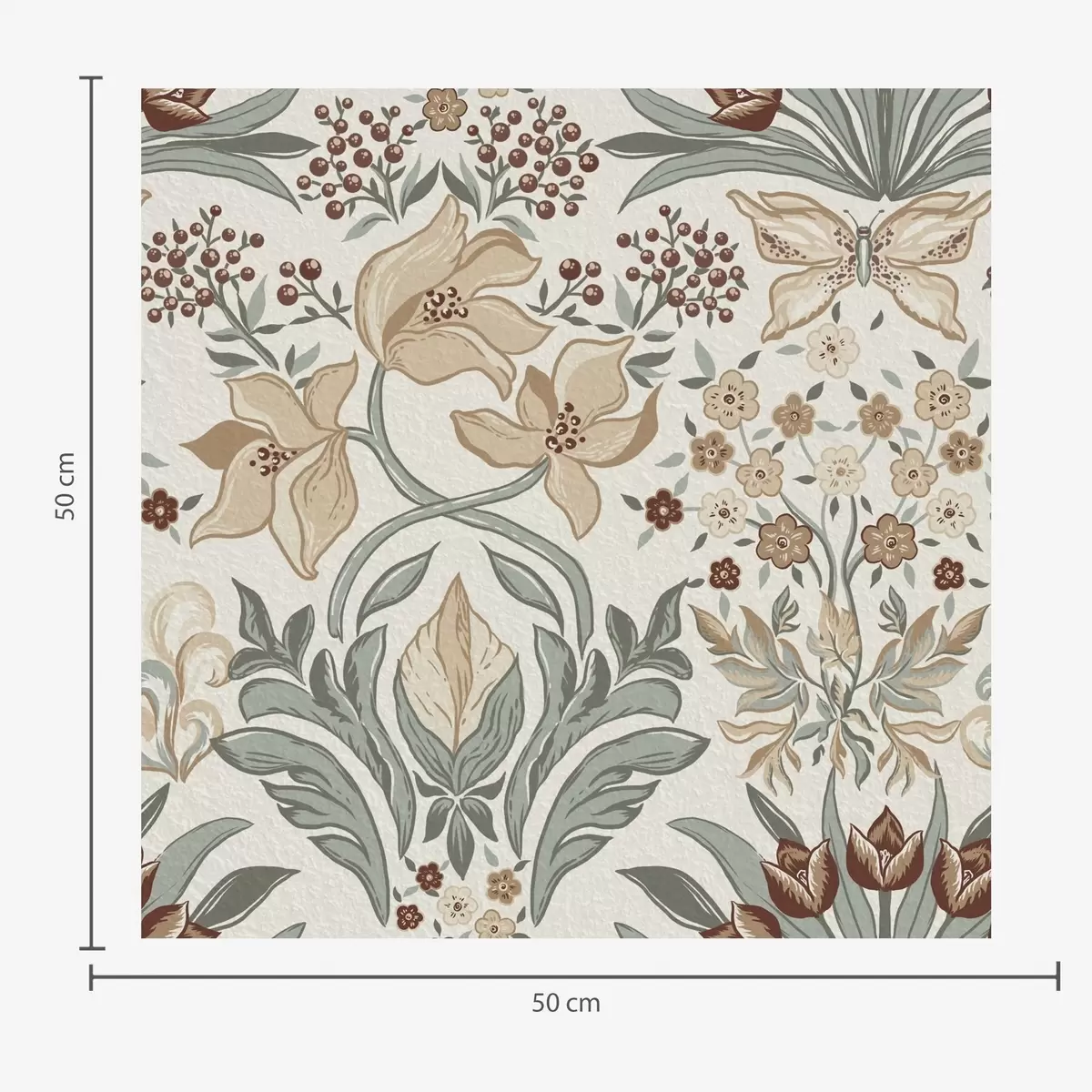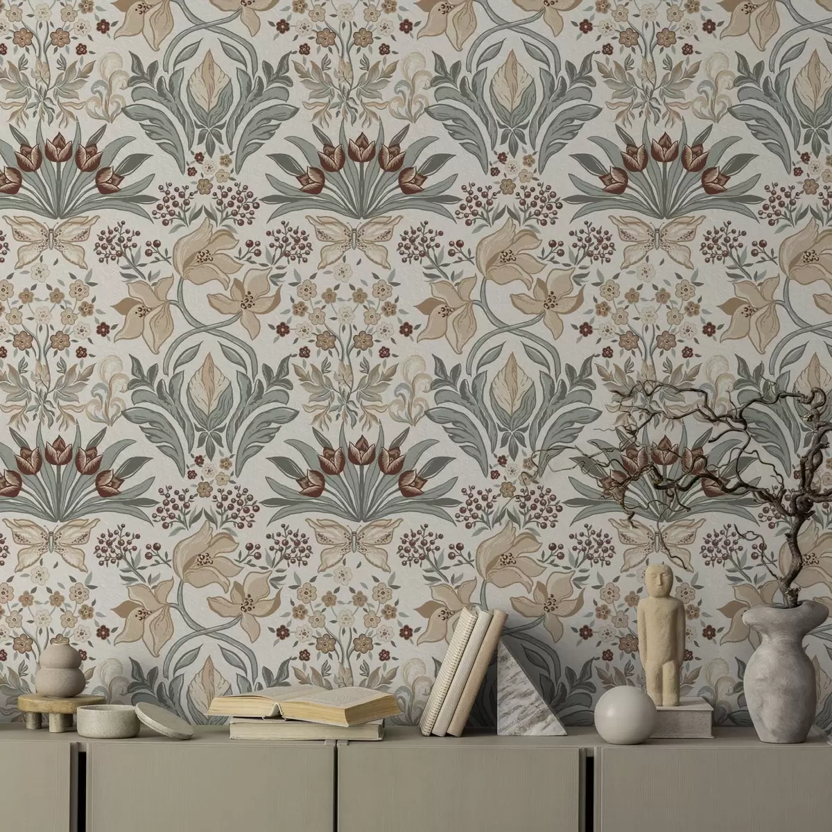 Tapete Dekorative Lilien und ein Schmetterling auf cremefarbenem Hintergrund Nr. a00500