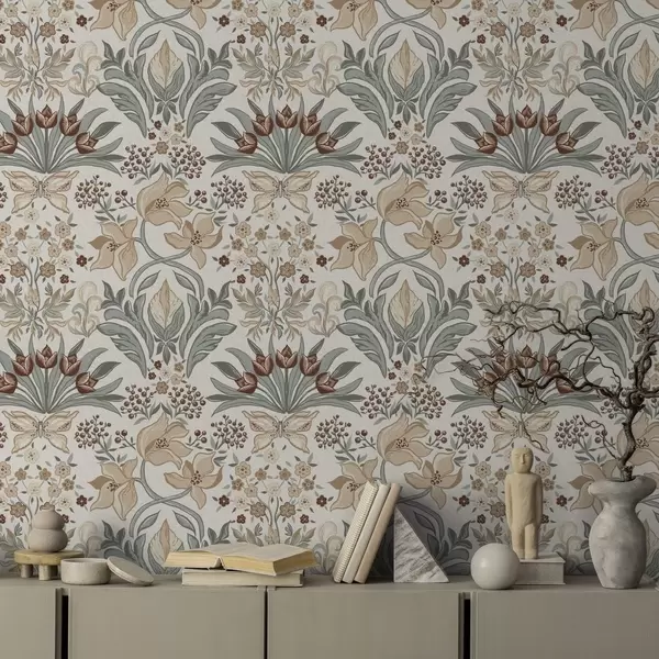 Tapete Dekorative Lilien und ein Schmetterling auf cremefarbenem Hintergrund Nr. a00500