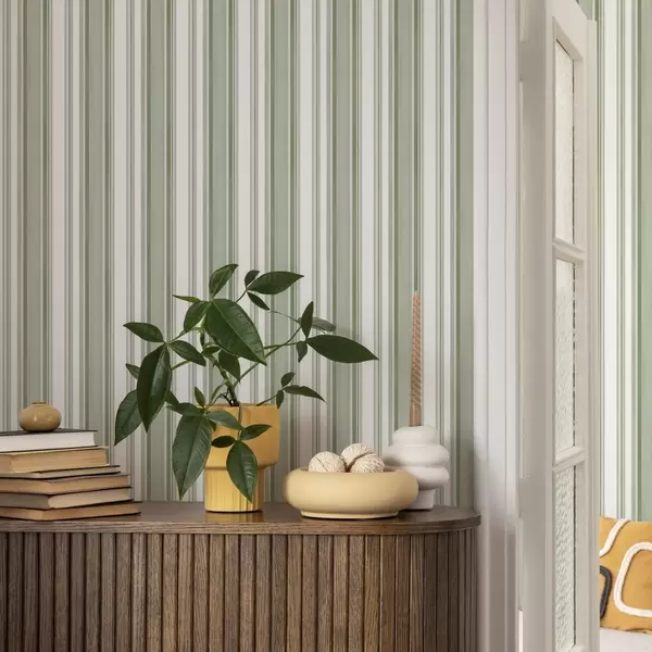 Tapete Grüne Streifen mit weißen Abständen und dünnen Linien Nr. a00526