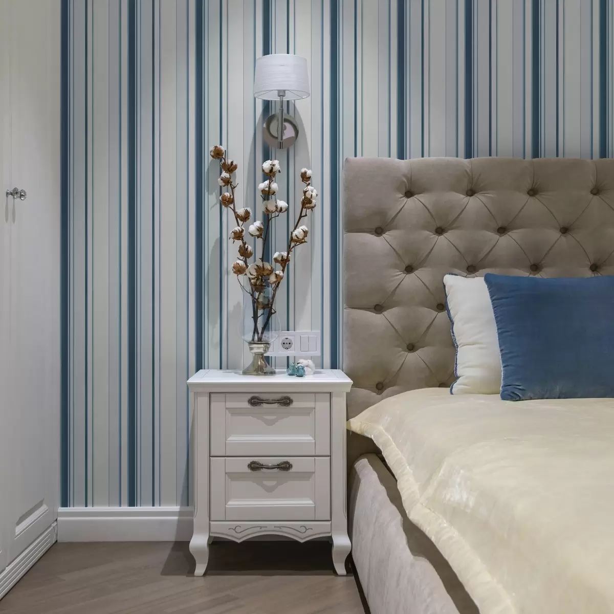 Tapete Türkisfarbene und blaue, unterschiedlich breite Streifen auf hellem Grund Nr. a00530