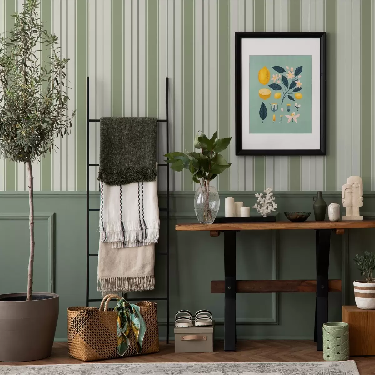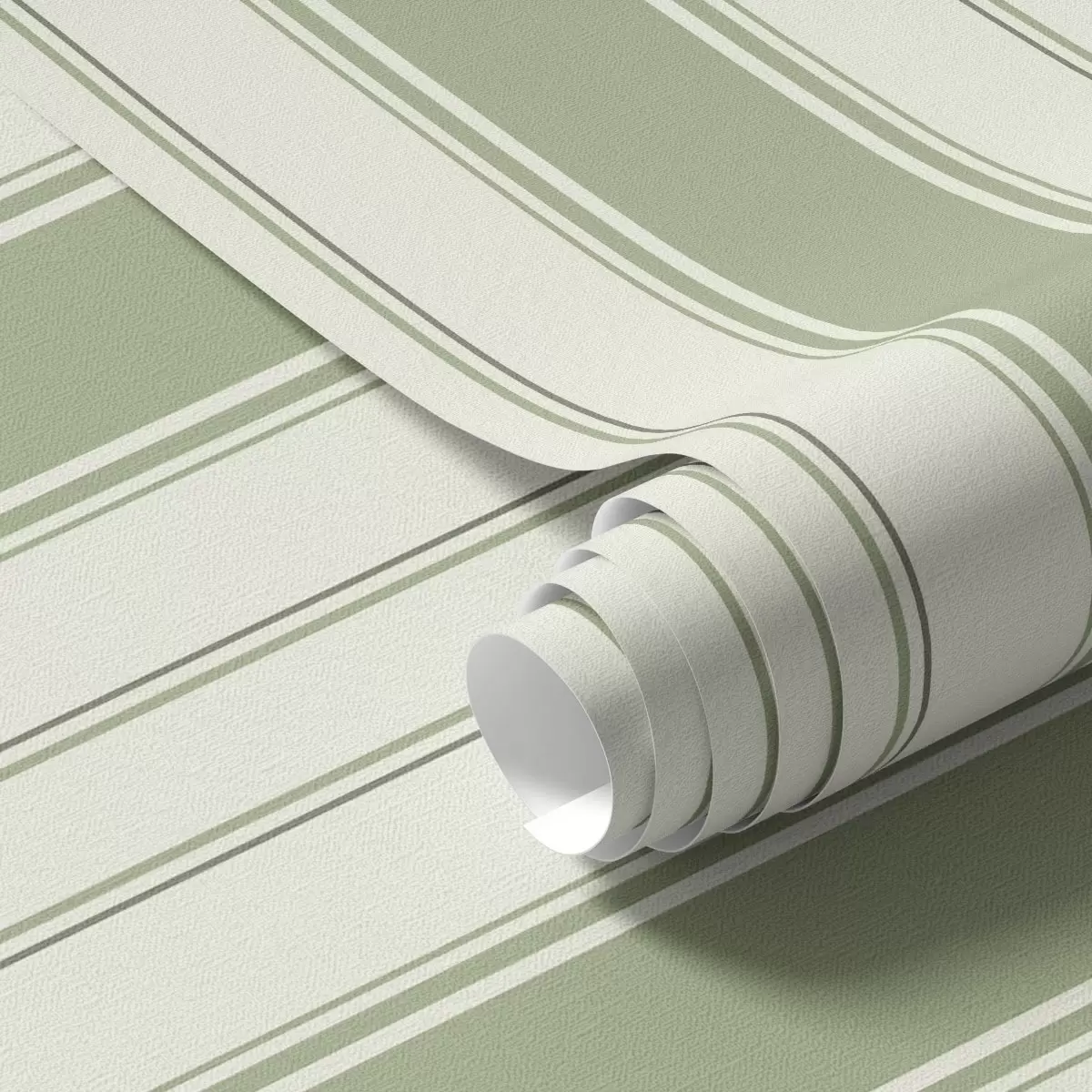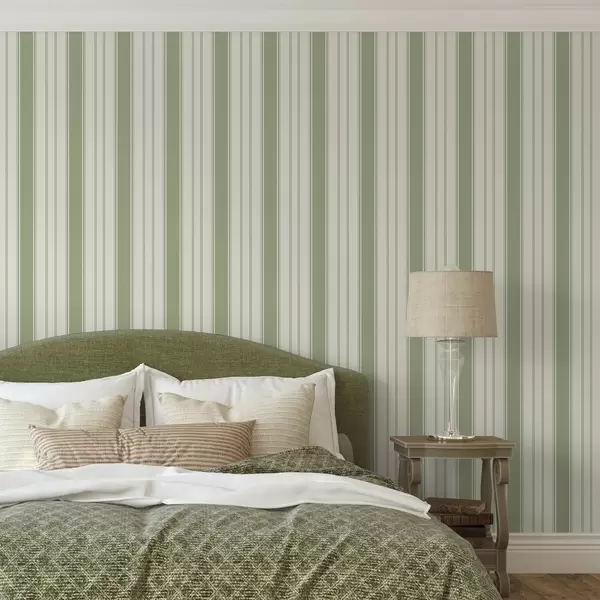 Tapete Cremefarbener Hintergrund mit gleichmäßigen grünen Längsstreifen Nr. a00560