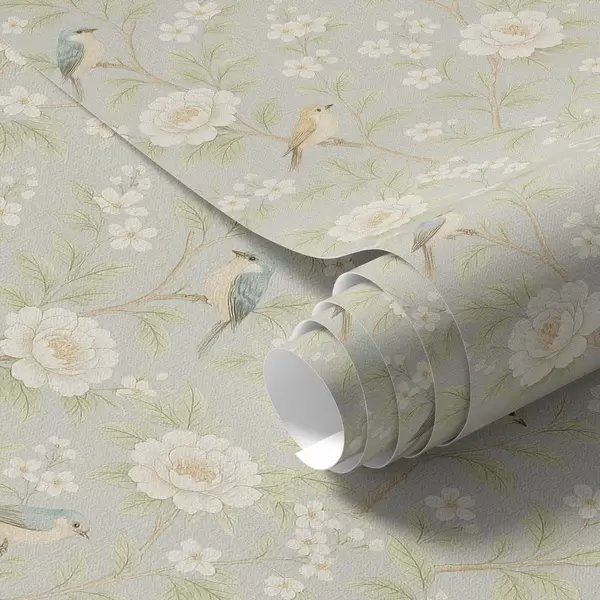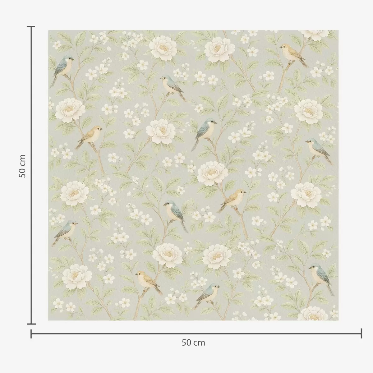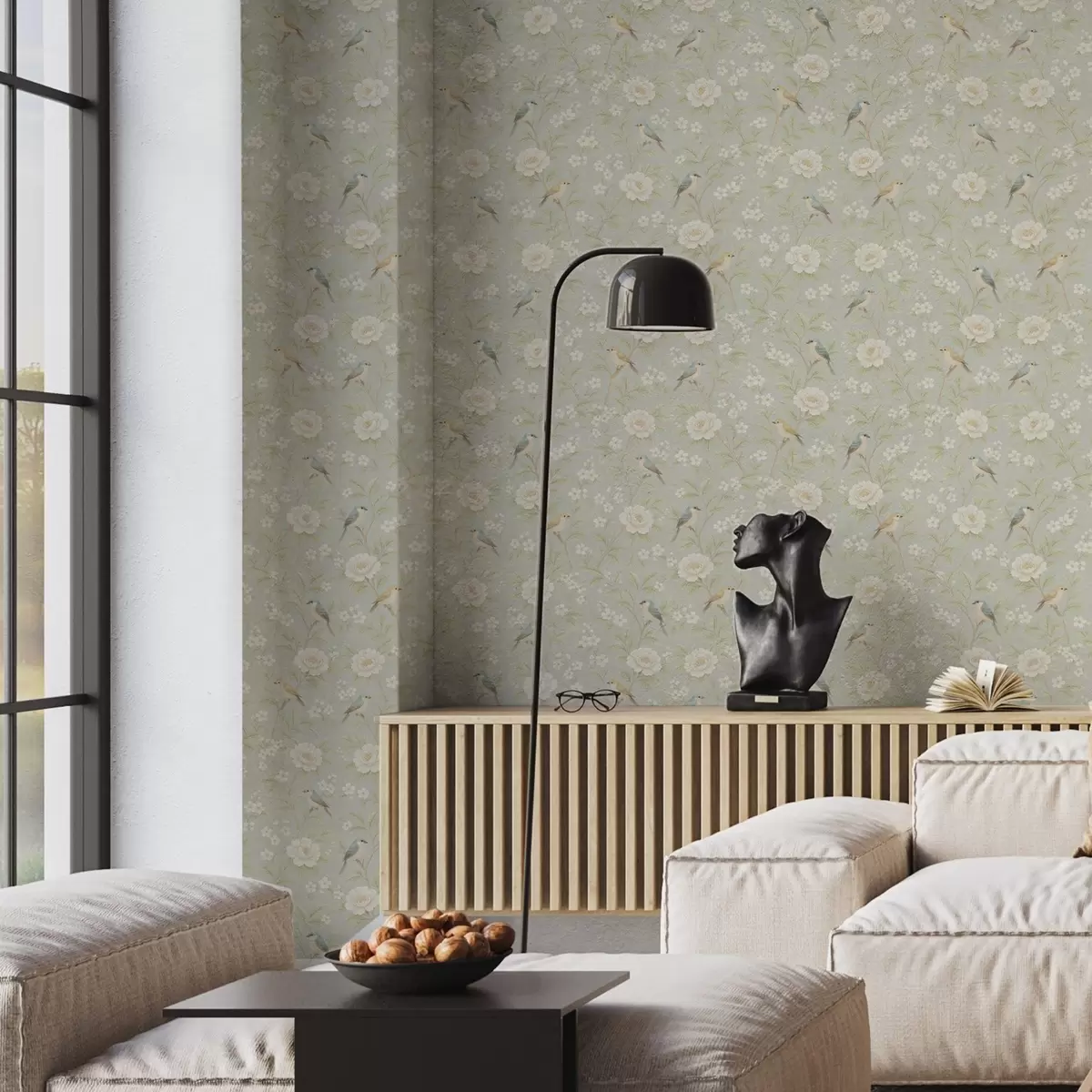 Tapete Vögel zwischen weißen Blüten auf grau-grünem Hintergrund Nr. a00583