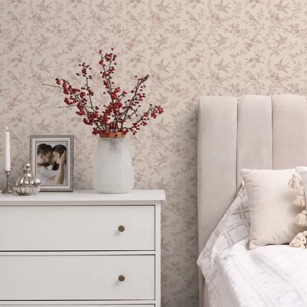 Tapete Vögel und Rosen, Vintage-Muster auf puderrosa Nr. a00587