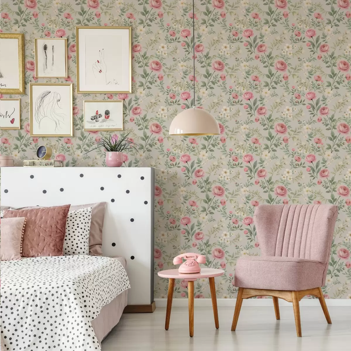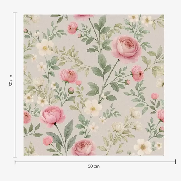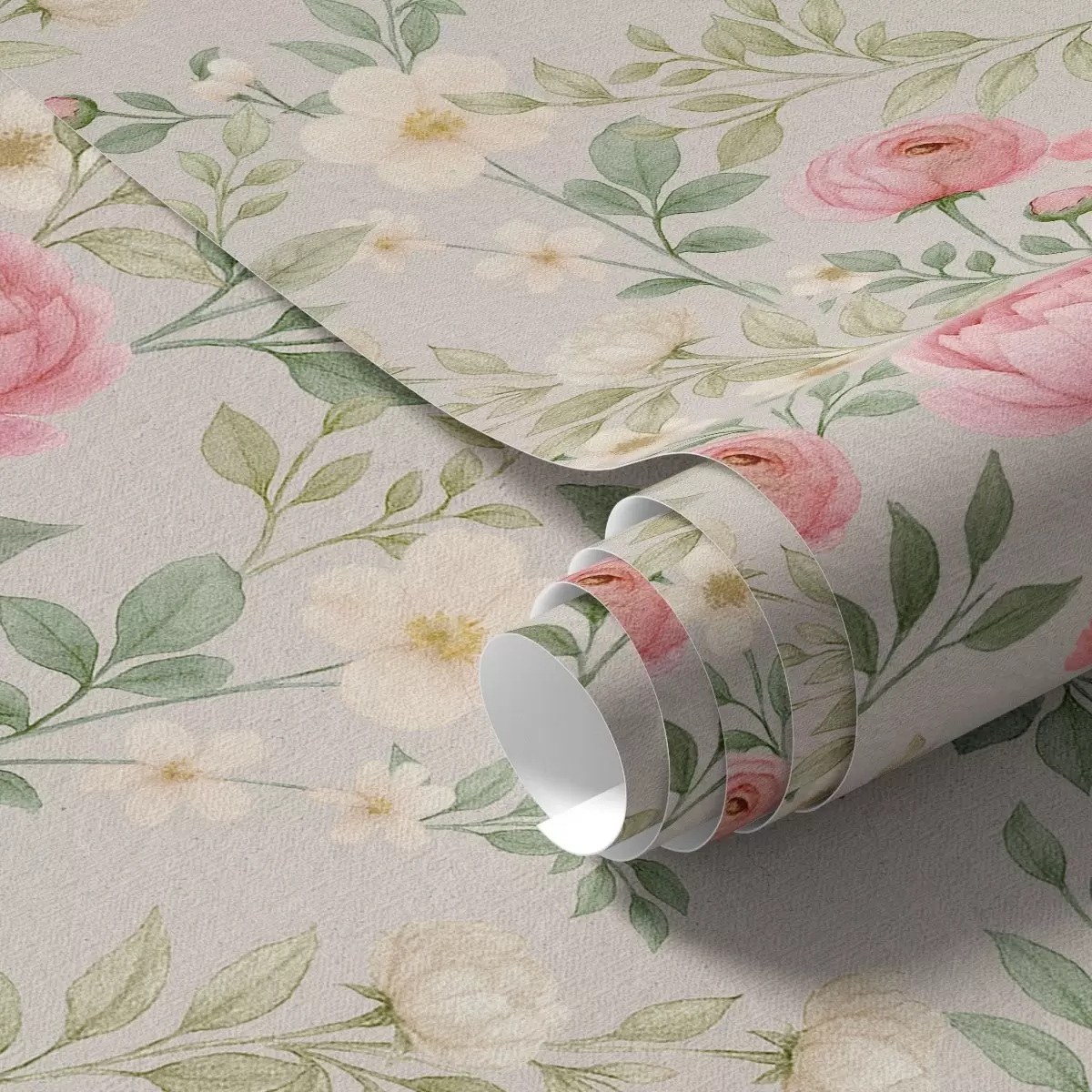 Tapete Aquarell-Pfingstrosen und weiße Blumen auf grau-beigem Hintergrund Nr. a00592