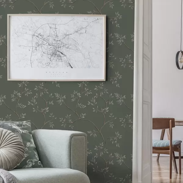 Tapete Zarte, blättrige Zweige auf dunkelgrünem Hintergrund Nr. a00597