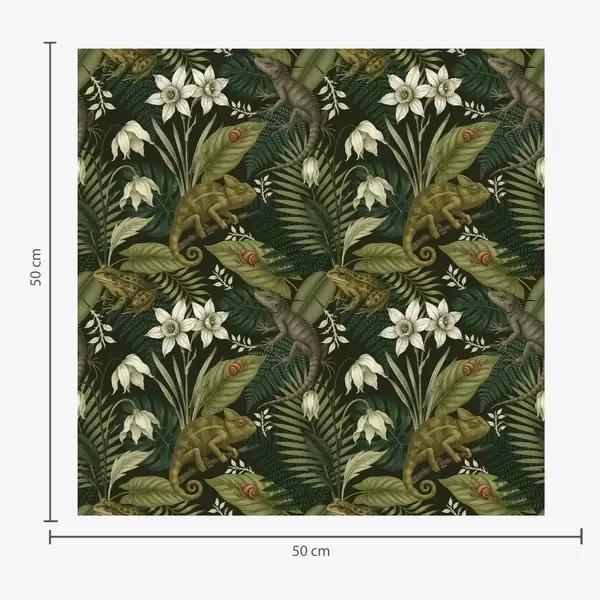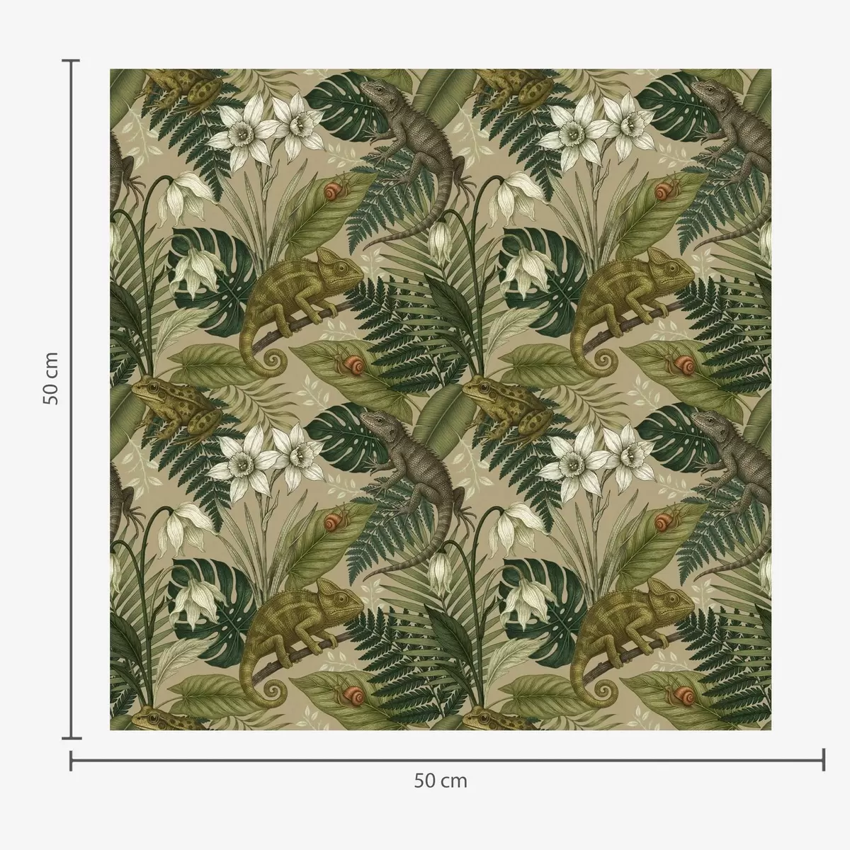 Tapete Chamäleons und tropische Blätter, weiße Blumen, beiger Hintergrund Nr. a00608