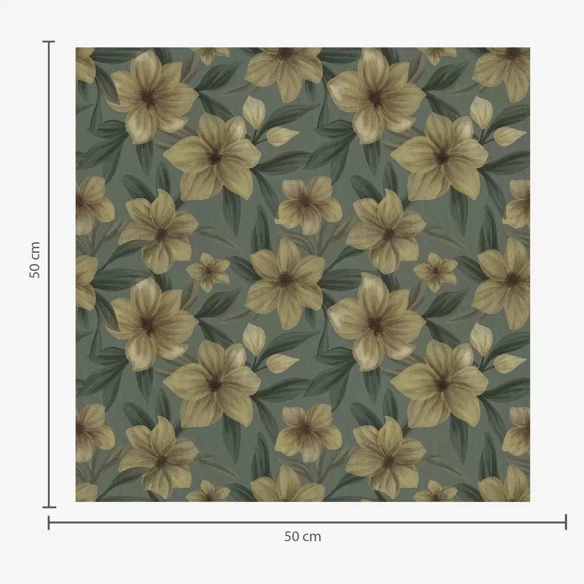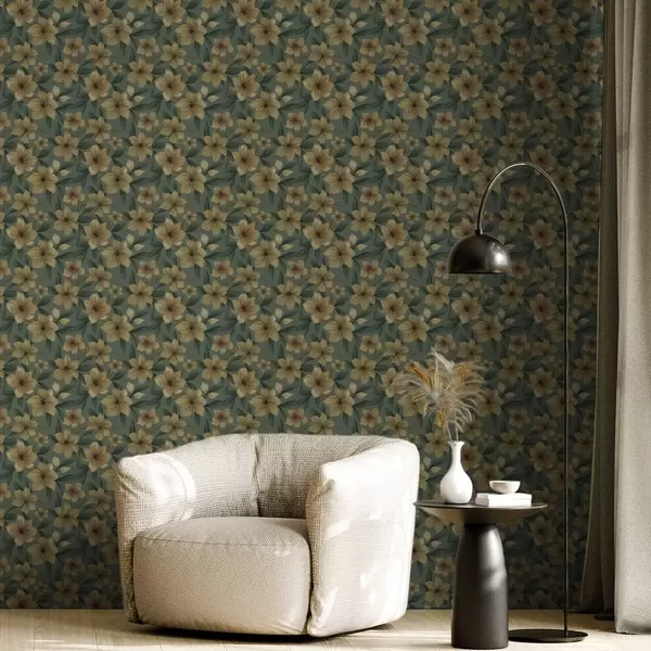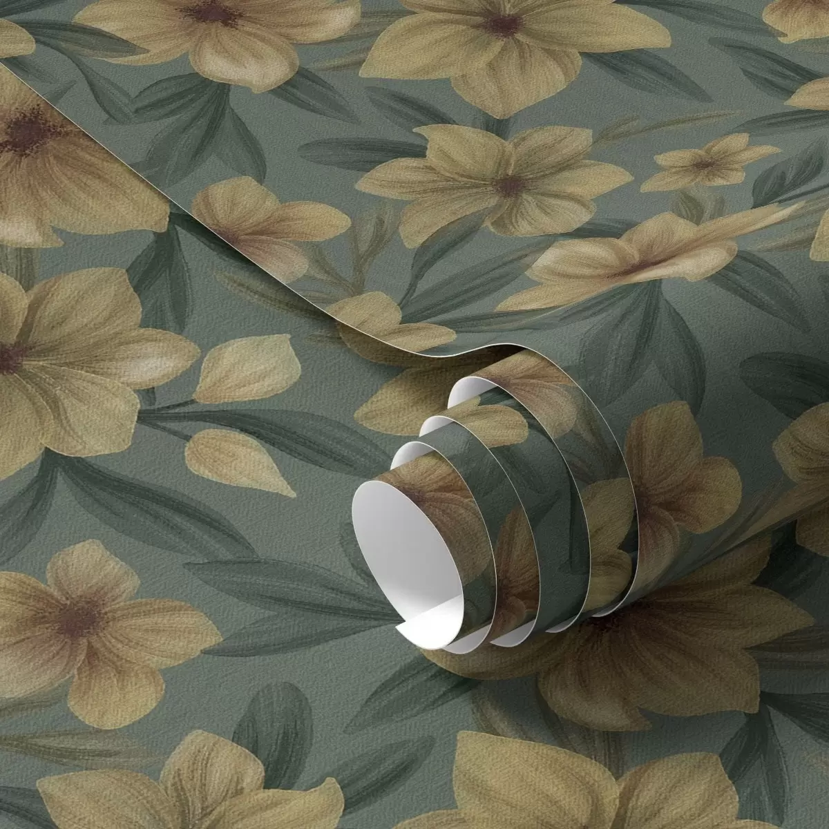 Tapete Ockerfarbene Blumen auf tiefgrünem Hintergrund, dichtes Muster a00628