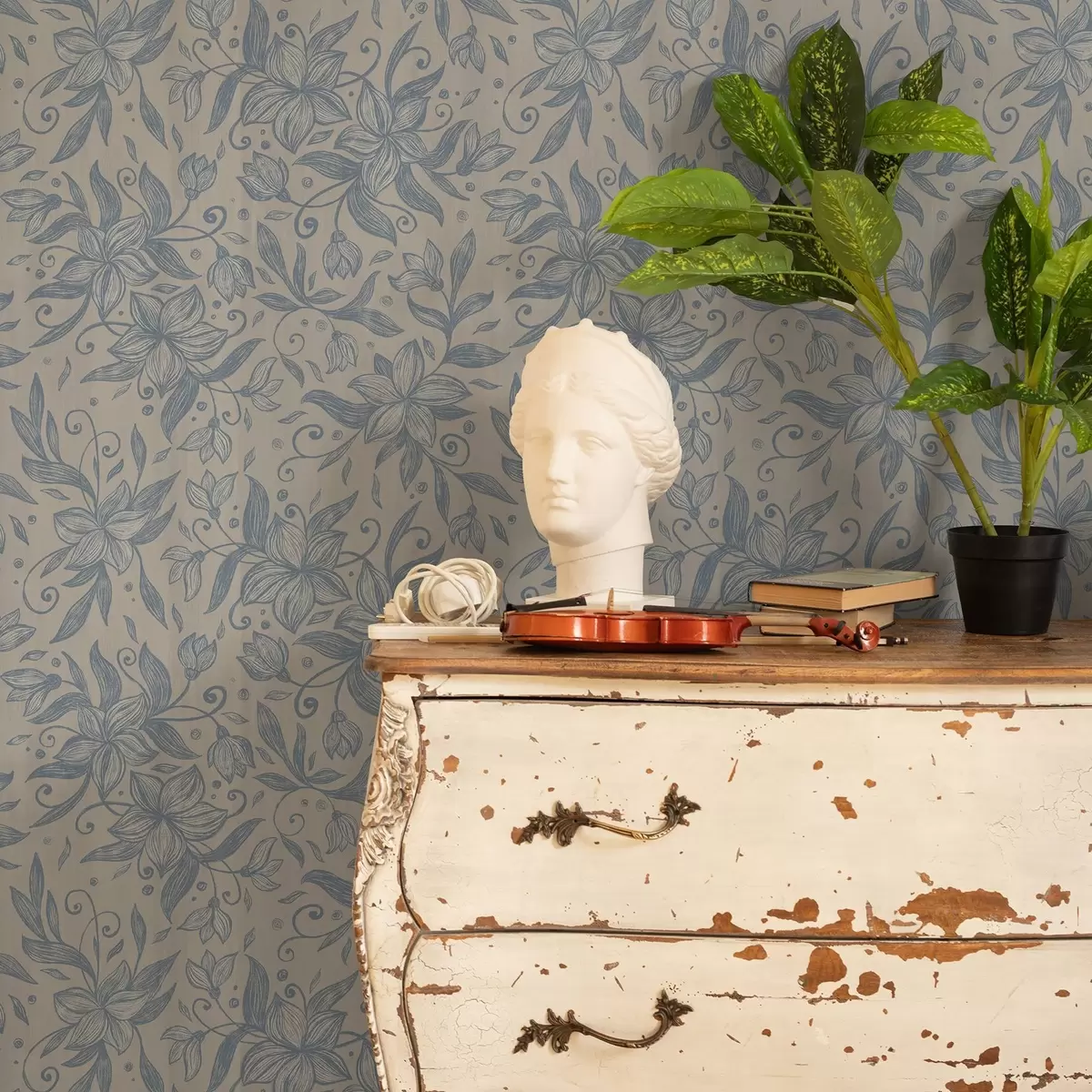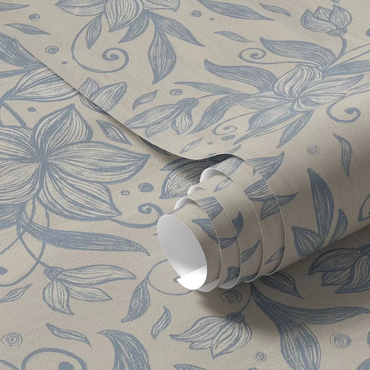 Tapete Blaues lineares Blumenmuster auf warmem Beige Nr. a00630v2