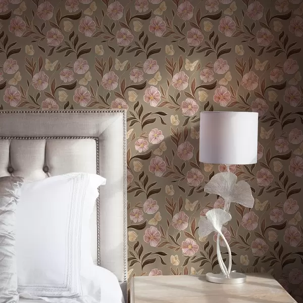 Tapete Rosa Blumen und Schmetterlinge auf olivbeigem Hintergrund Nr. a00633v2