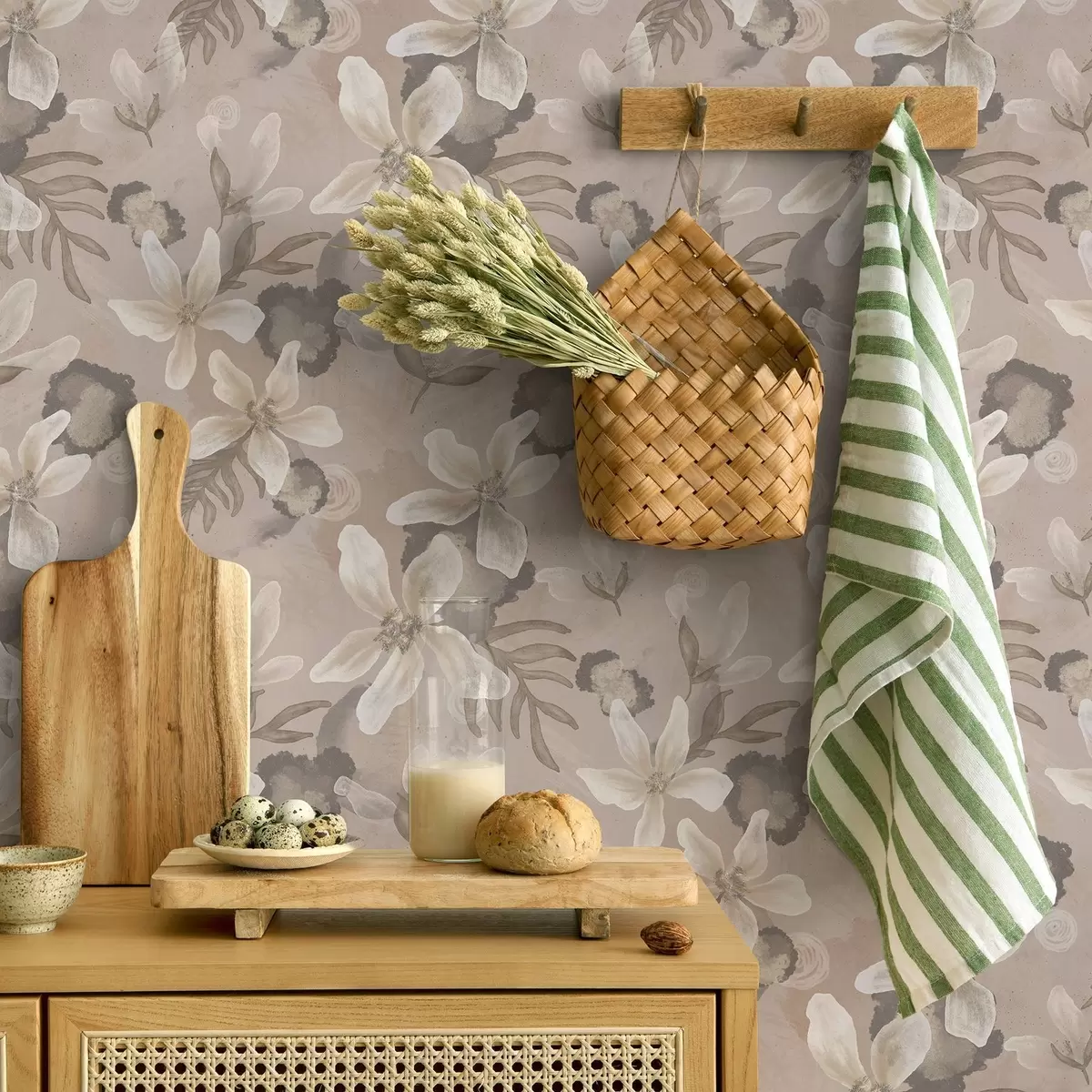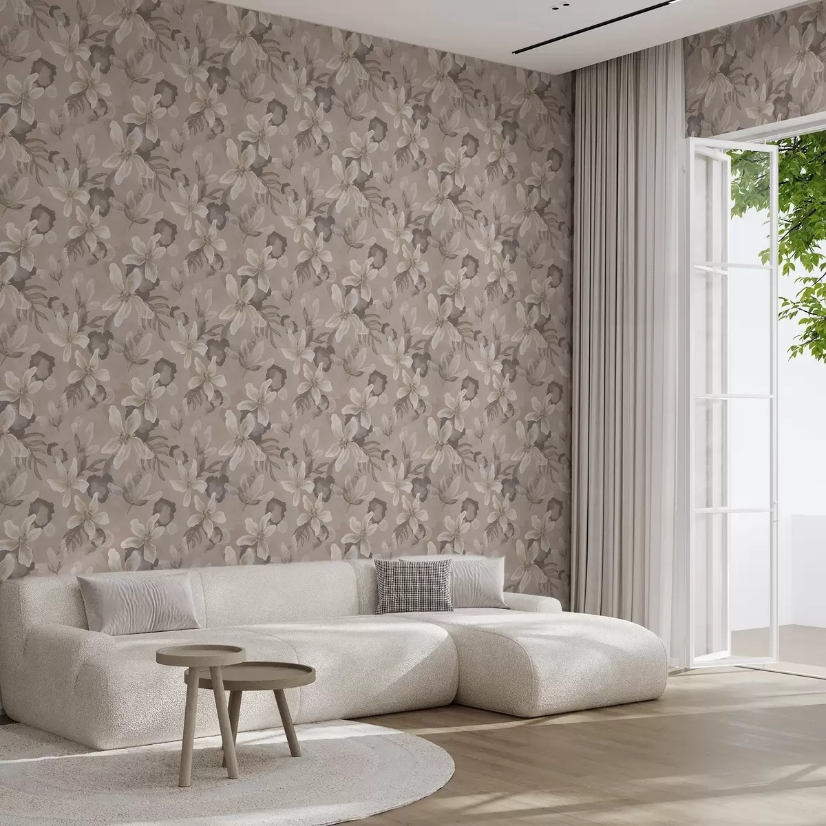 Tapete Große beigefarbene Blumen mit abstrakten Wasserfarbenflecken Nr. a00635