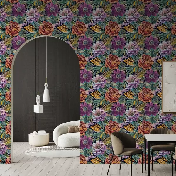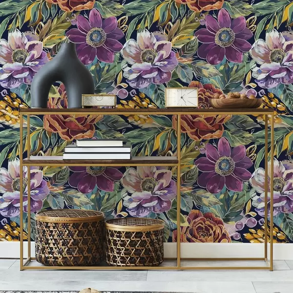 Tapete Kräftige, großflächige, mit Pinsel gemalte Blumen auf dunkelblauem Hintergrund Nr. a00643
