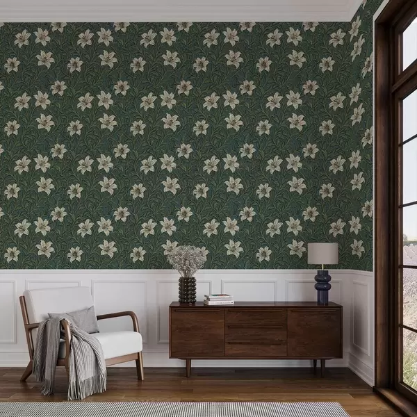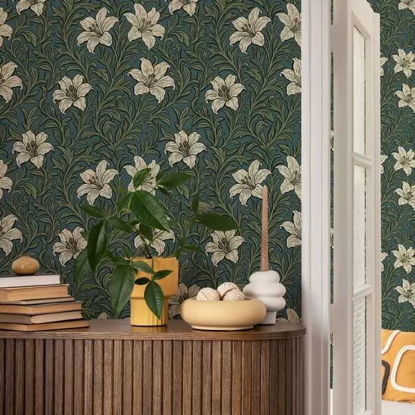 Tapete Cremefarbene Lilien inmitten von dichtem Grün auf türkisfarbenem Hintergrund Nr. a00645