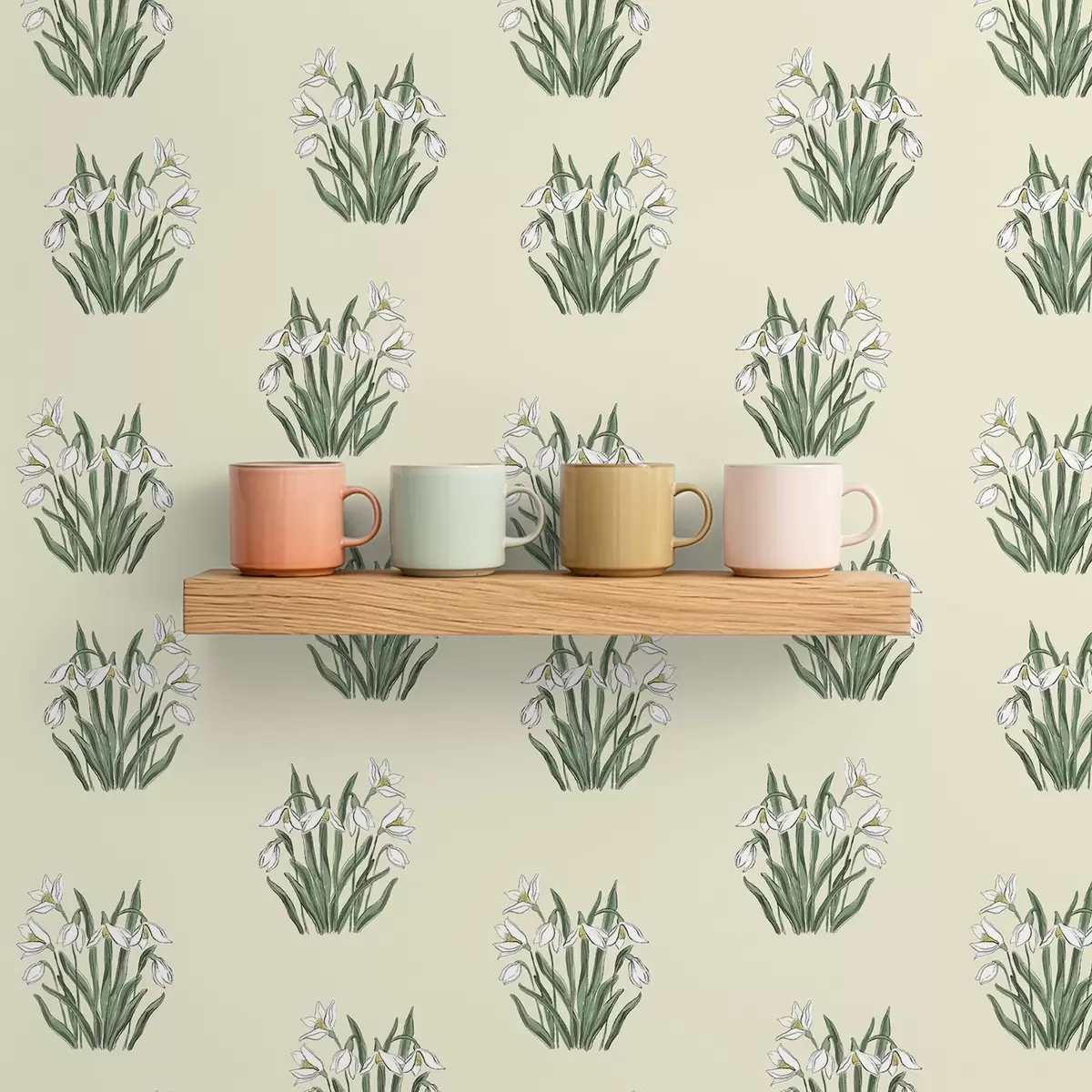 Tapete Schneeglöckchen mit grünen Blättern auf cremefarbenem Hintergrund Nr. a00651v2