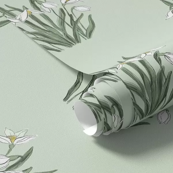 Tapete Schneeglöckchen mit grünen Blättern auf warmem gelbem Hintergrund Nr. a00651v3