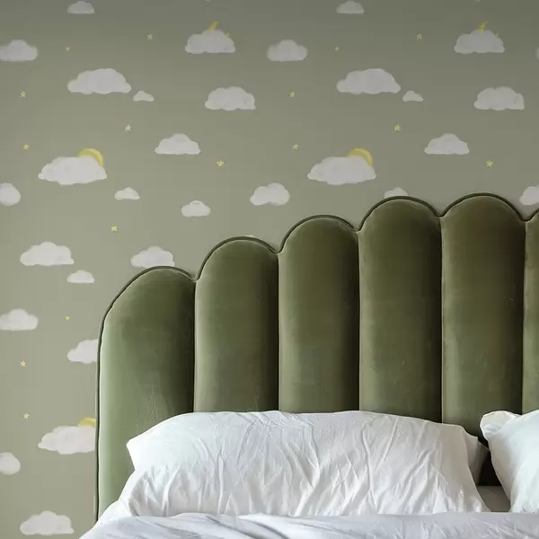 Tapete Weiche Wolken, Sterne und Sonne auf grünlich-grauem Hintergrund Nr. a00652v1