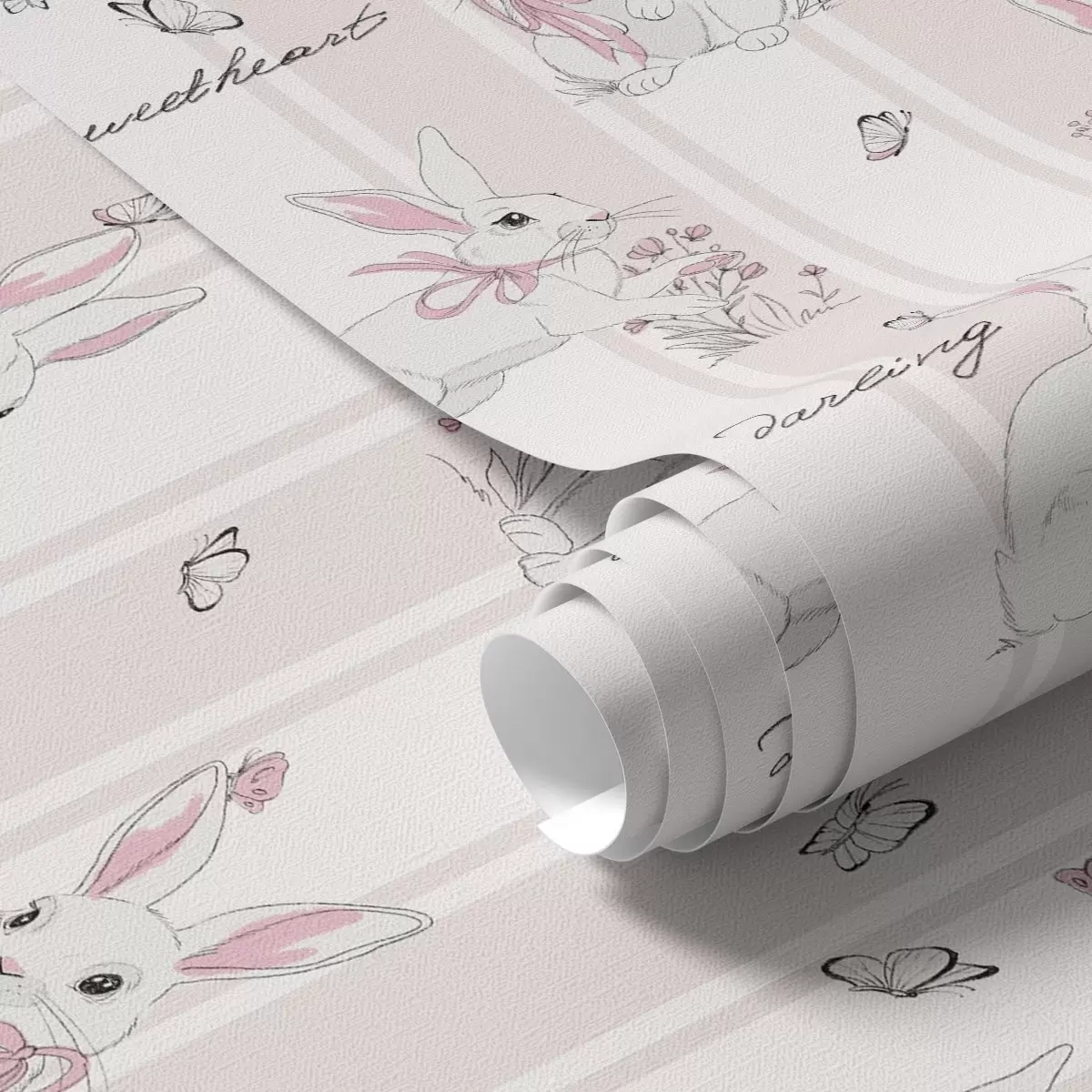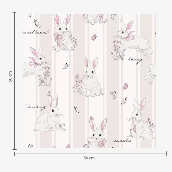 Tapete Hasen mit Schleifen, rosa Streifen und kleinen Schriftzügen Nr. a00657